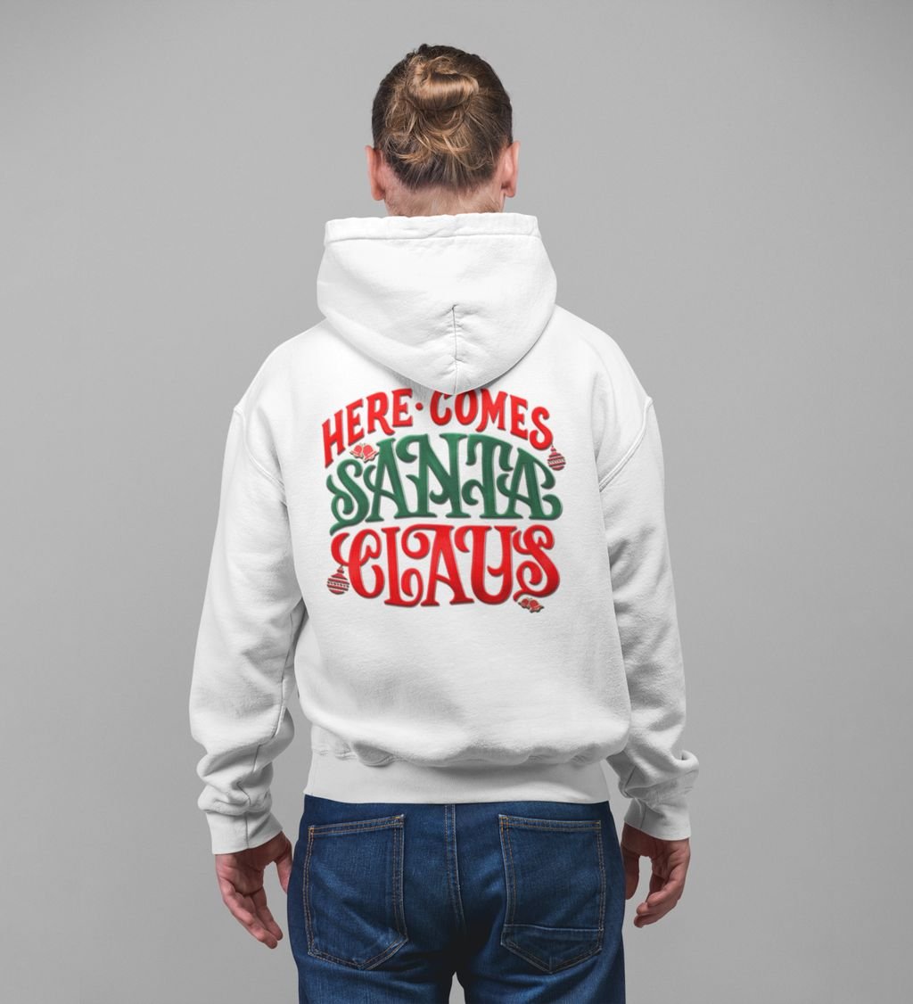 Here Comes Santa Claus in Classic Red Ready to Spread Holiday Magic and Cheer Printed White Cotton Hoodie