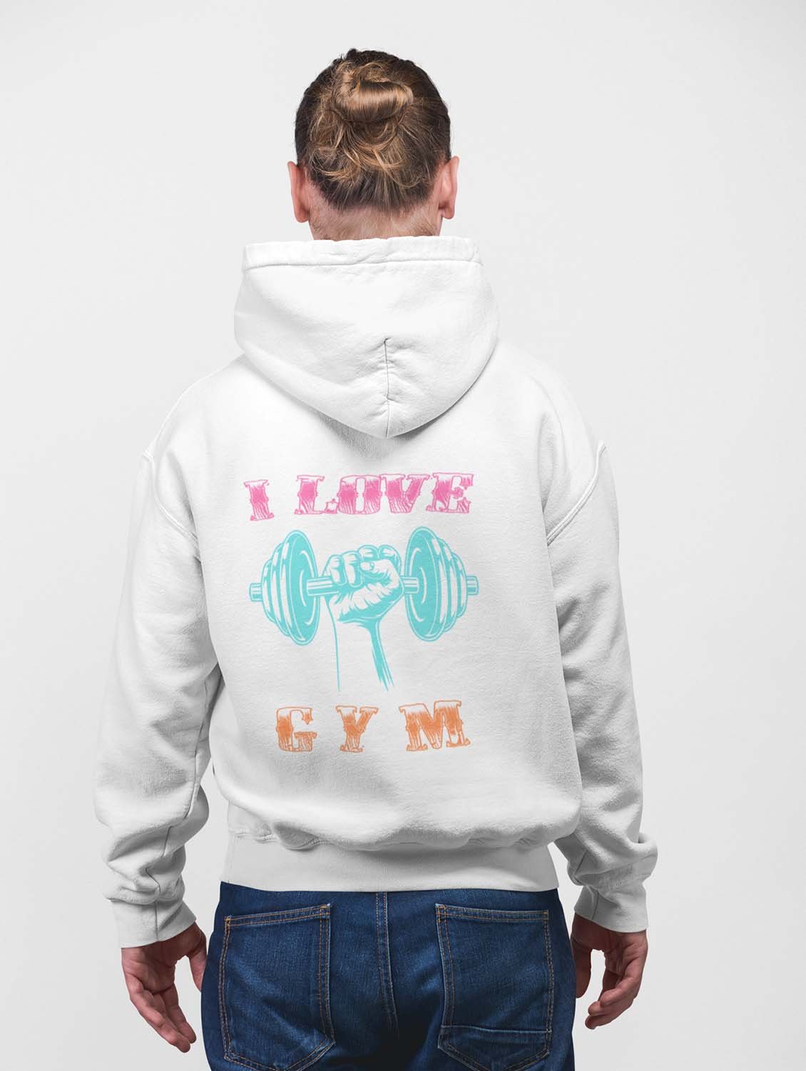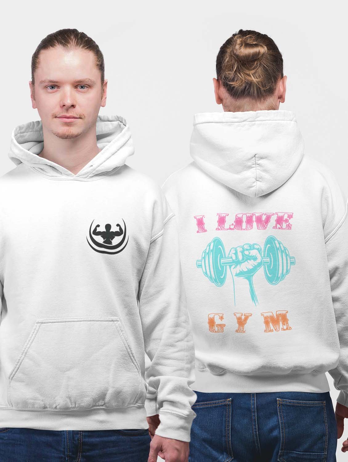 I Love Gym, (Pink and Orange Text) printed artswear white hoodies for winter casual wear specially for Men