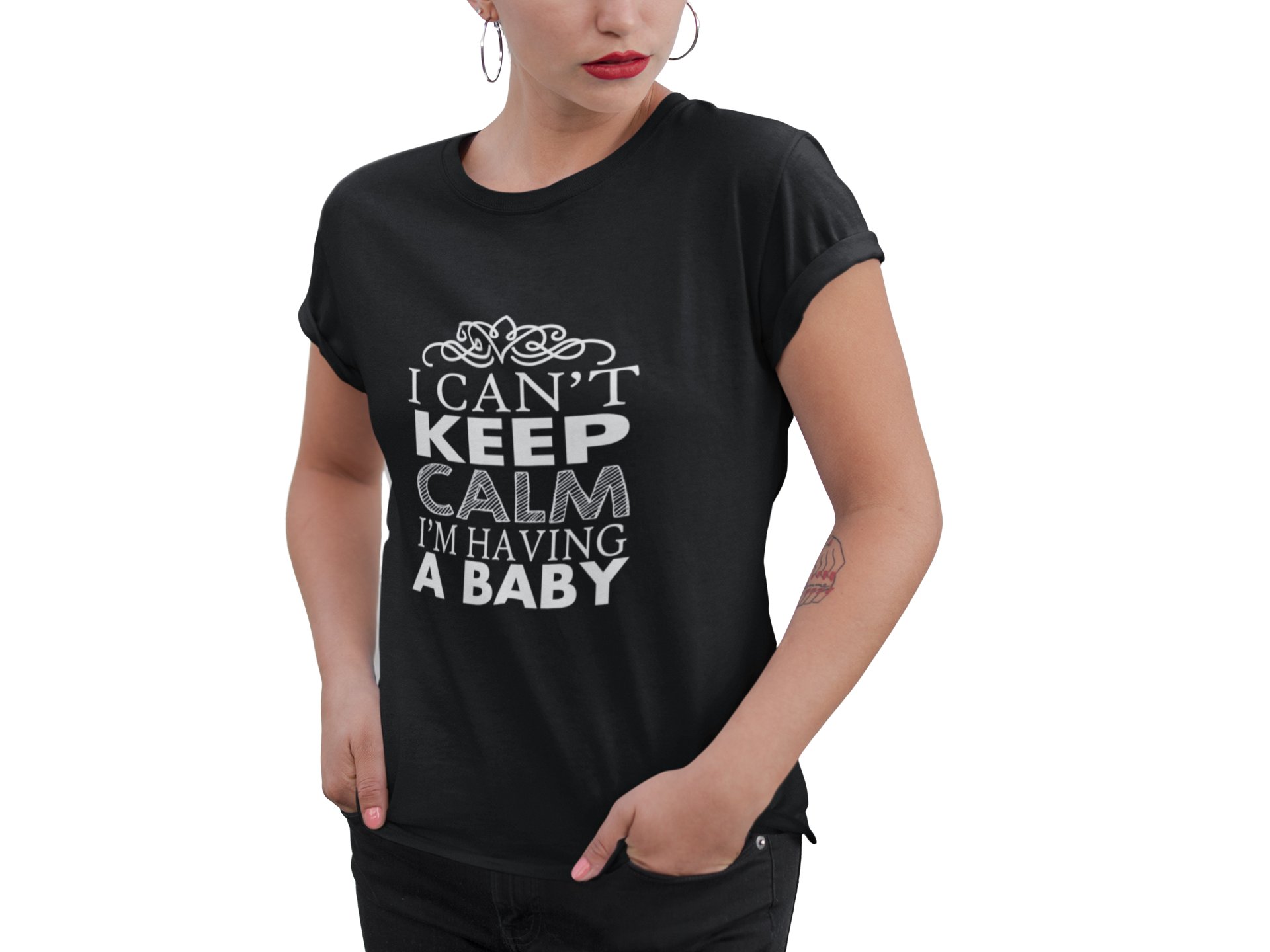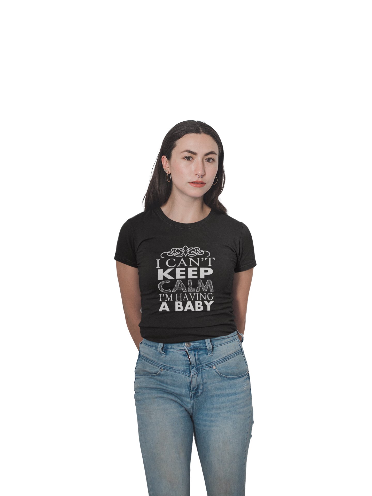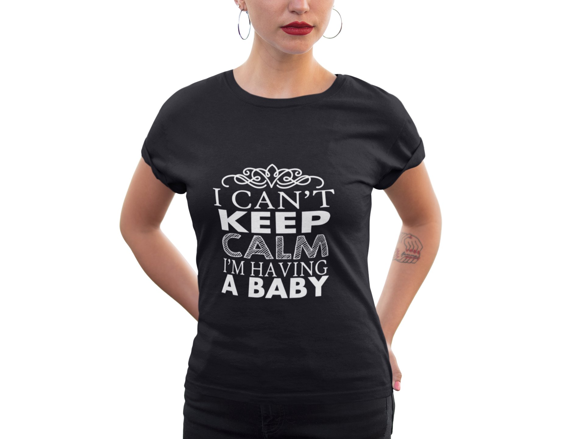 I'm having a baby-printed family themed cotton blended half-sleeve t-shirts made for women (black)