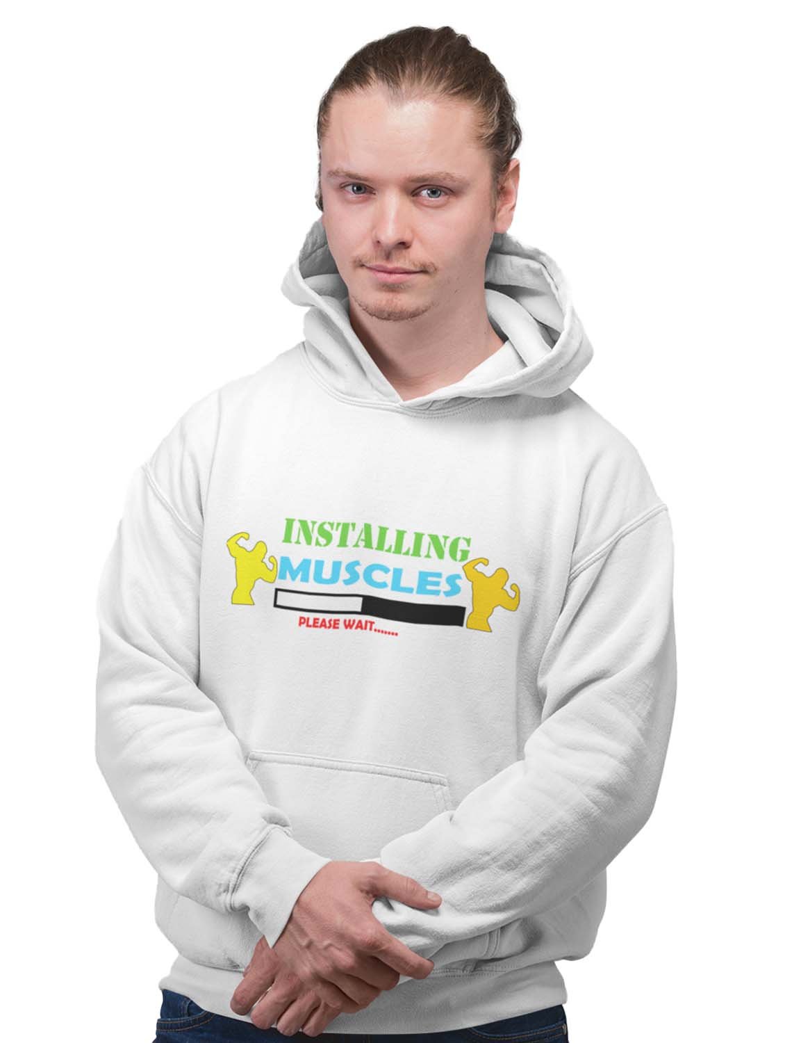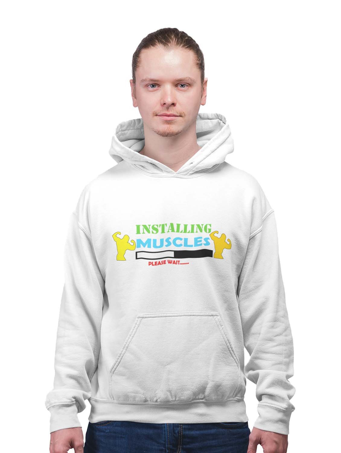 Installing Muscles, Please Wait, (BG Green Blue &Red)printed artswear white hoodies for winter casual wear specially for Men