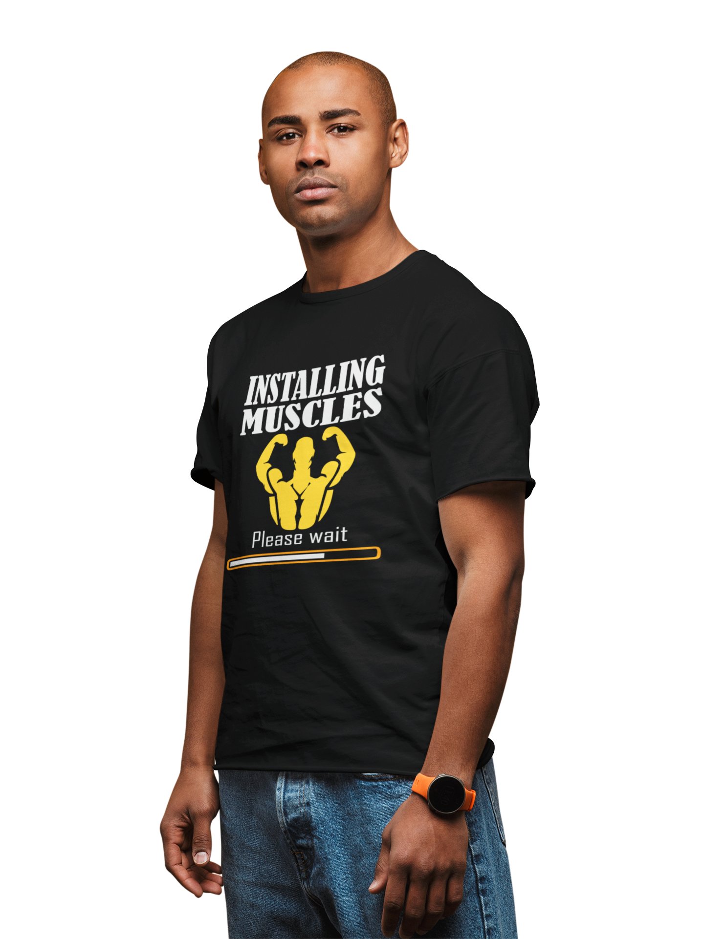 Installing Muscles, Please Wait, (BG White and Yellow), Round Neck Gym Tshirt (Black Tshirt) - Clothes for Gym Lovers - Suitable for Gym Going Person - Foremost Gifting Material for Your Friends and Close Ones