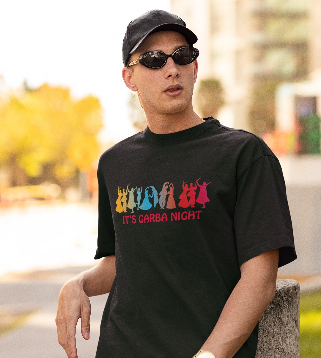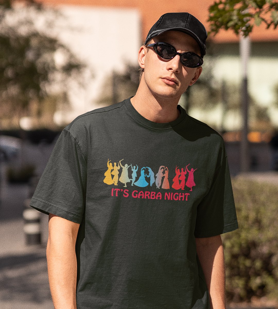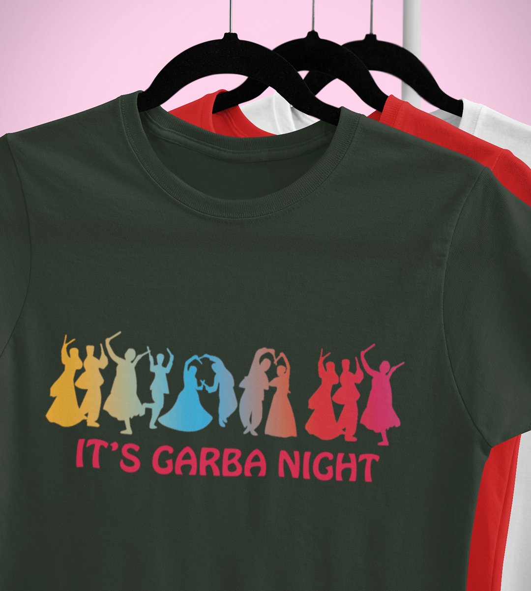 Its garba night printed unisex adults round neck cotton half-sleeve green tshirt specially for Navratri festival/ Durga puja