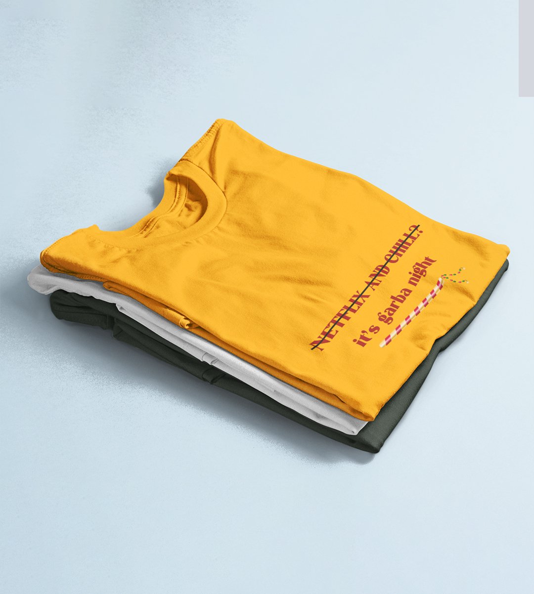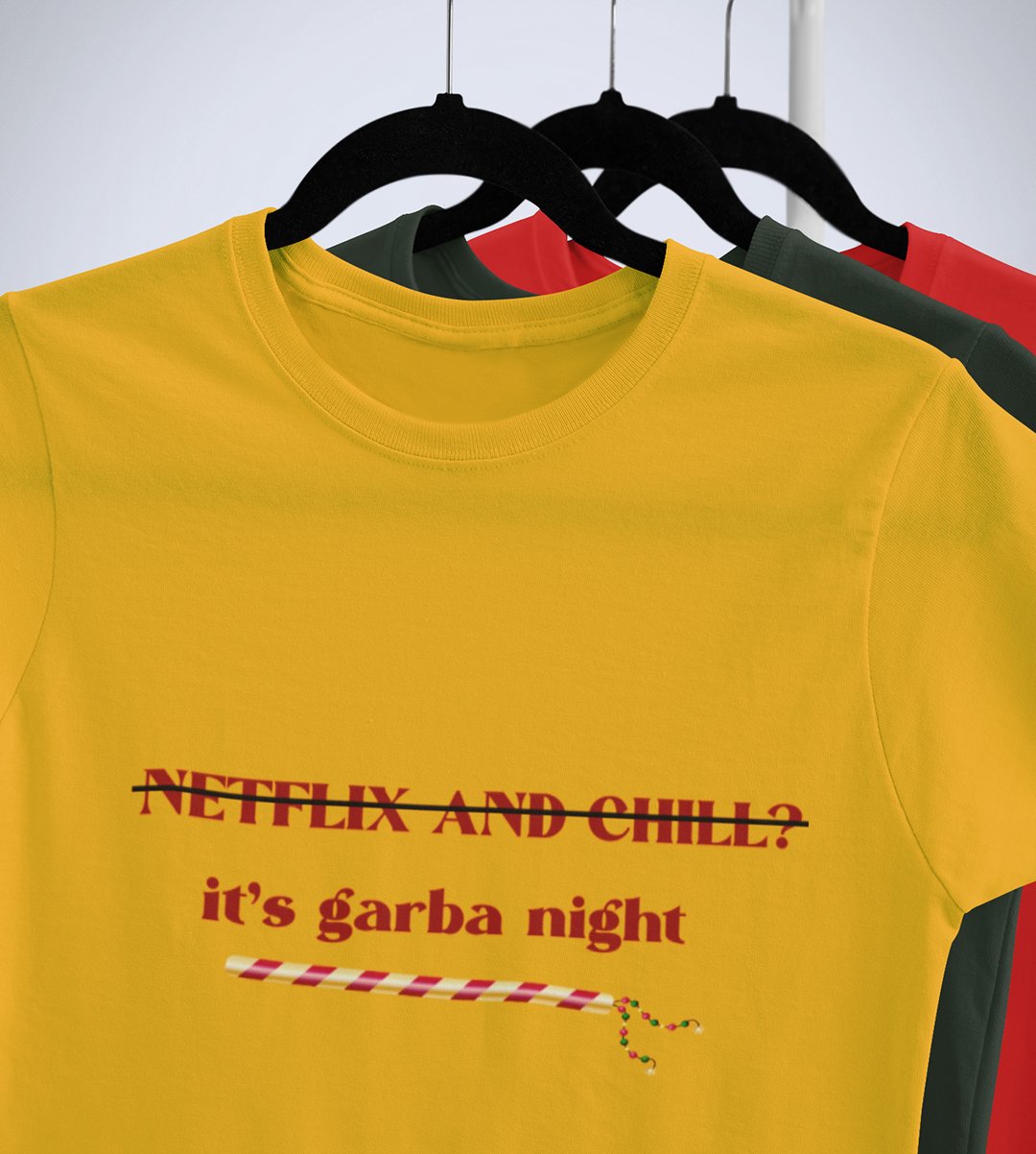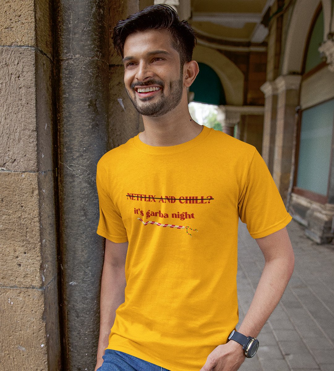It's garba night printed unisex adults round neck cotton half-sleeve yellow tshirt specially for Navratri festival/ Durga puja