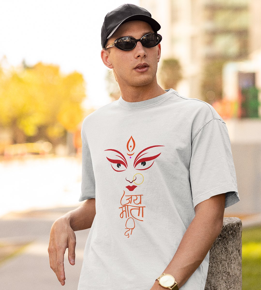 Jai Mata di printed unisex adults round neck cotton half-sleeve white tshirt specially for Navratri festival/ Durga puja