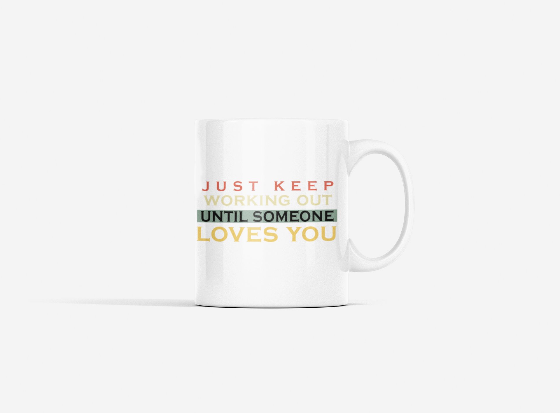 Just Keep Working Out, Until Someone Loves You, (BG Orange, Yellow, Black, White) - gym themed printed ceramic white coffee and tea mugs/ cups for gym lovers