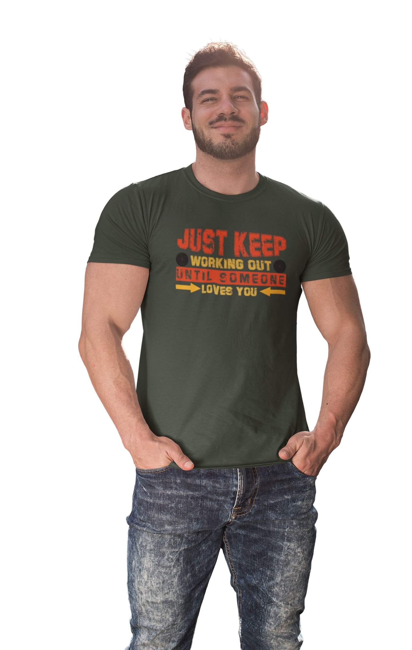 Just Keep Working Out, Until Someone Loves You, Round Neck Gym Tshirt - Foremost Gifting Material for Your Friends and Close Ones