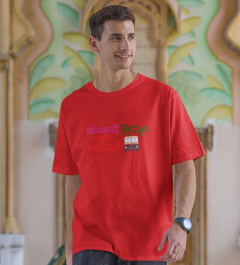 Just Konkani Things Red Round Neck Cotton Half Sleeved Mens T Shirt with Printed Graphics