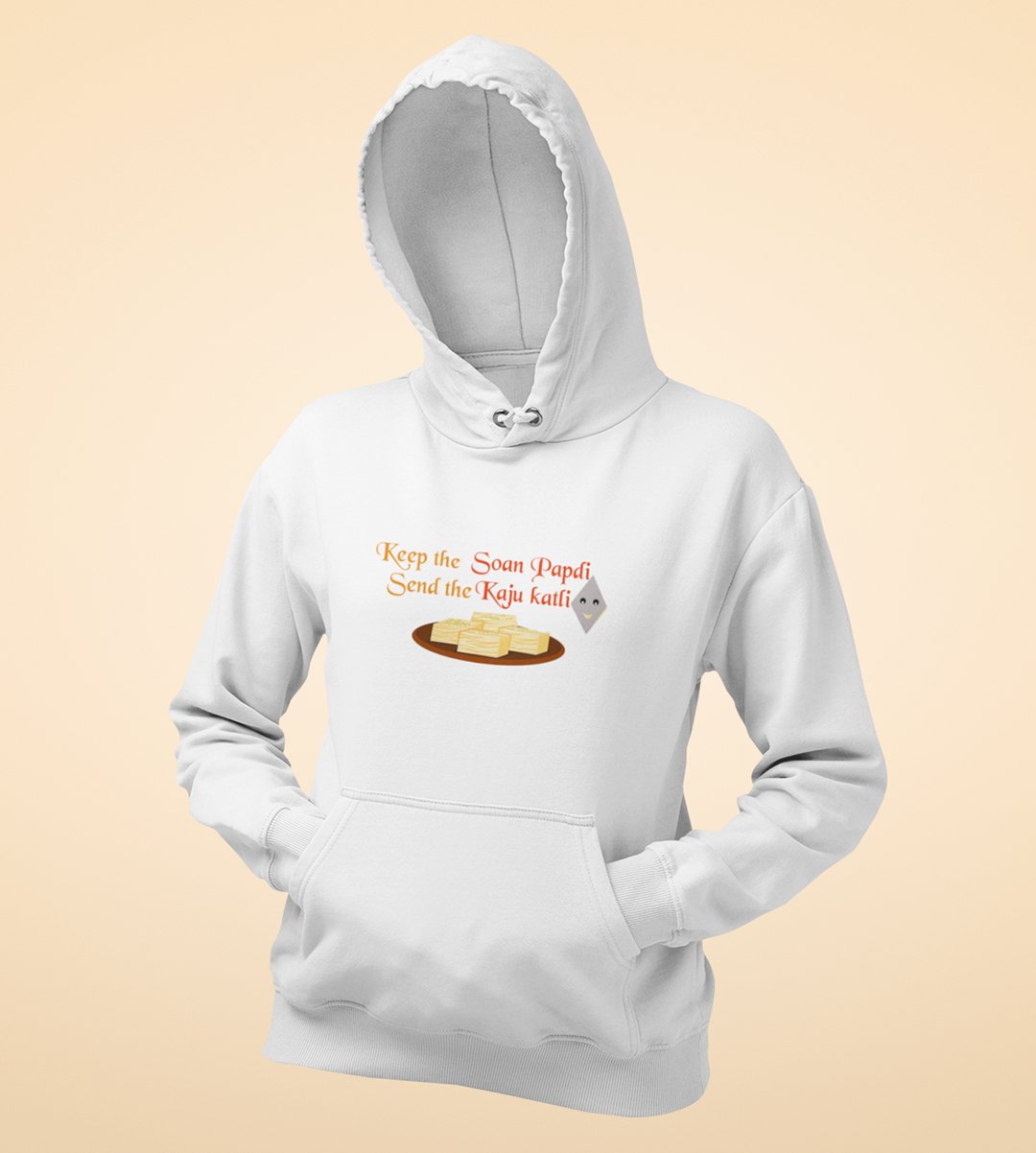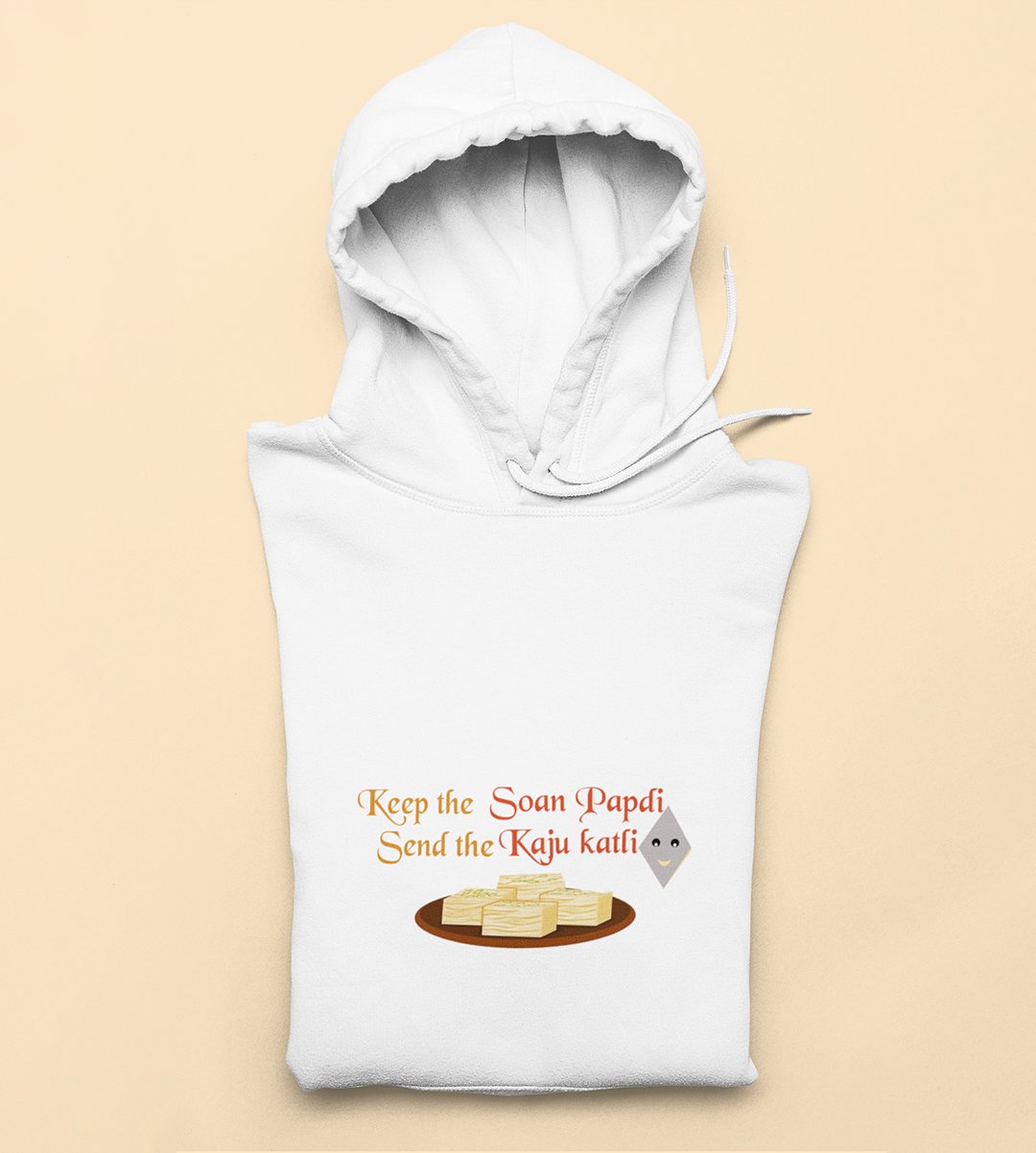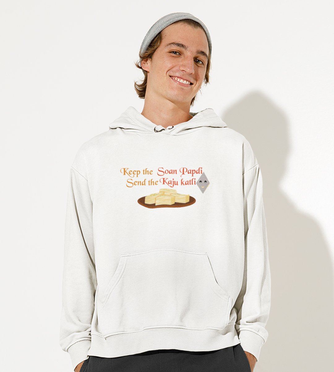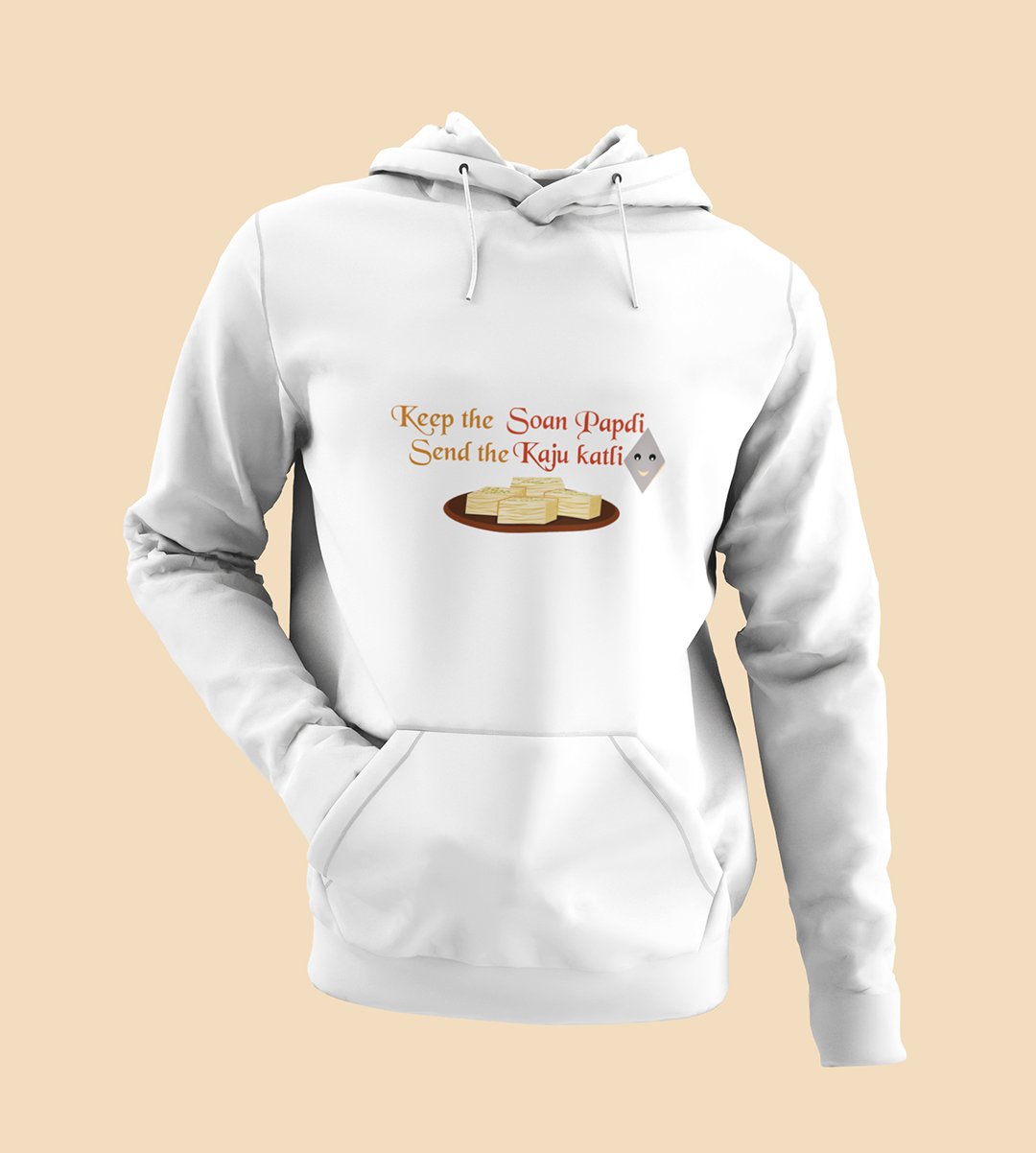 Indulge in the sweetness of Diwali with our "Diwali Sweets Delight" White Hoodie . The witty message "Keep the Sonpapdi, Send the Kaju Katli" adds a lighthearted touch to the festive season. Sip your and savor the flavors of Diwali with this delightful White Hoodie .