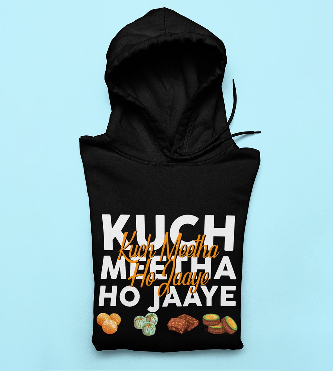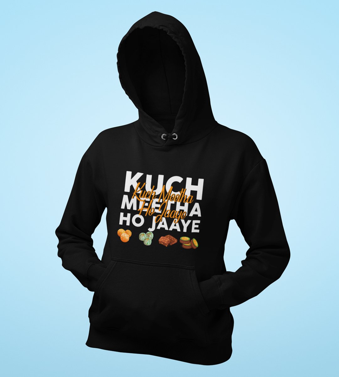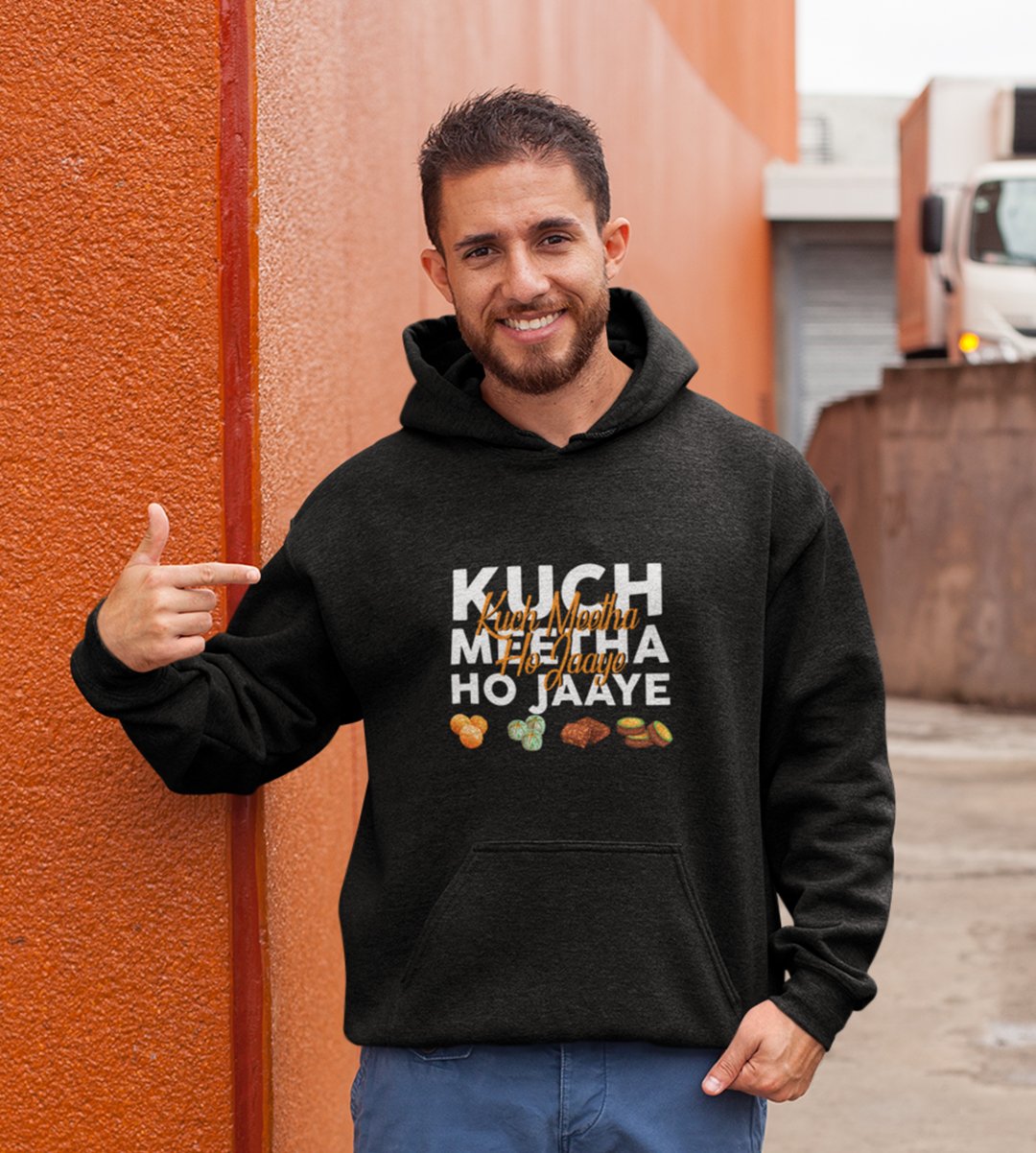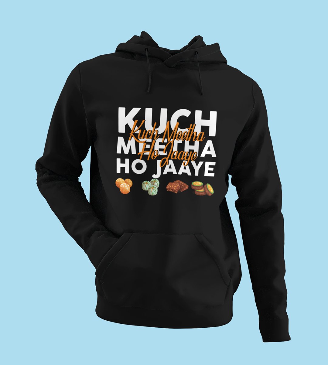 Satisfy your sweet cravings with our "Sweet Indulgence" black Hoodie . The message "Kuch Meetha Ho Jaye" invites you to dive into a delightful world of sweets and treats. This playful design features an array of delectable confections, making every sip a celebration of sweetness and joy.