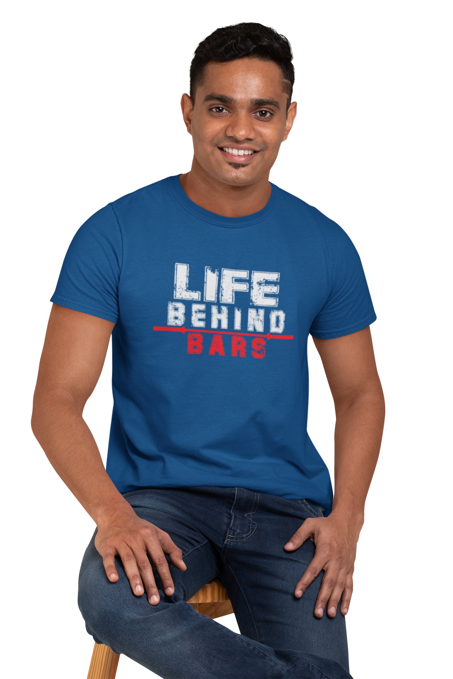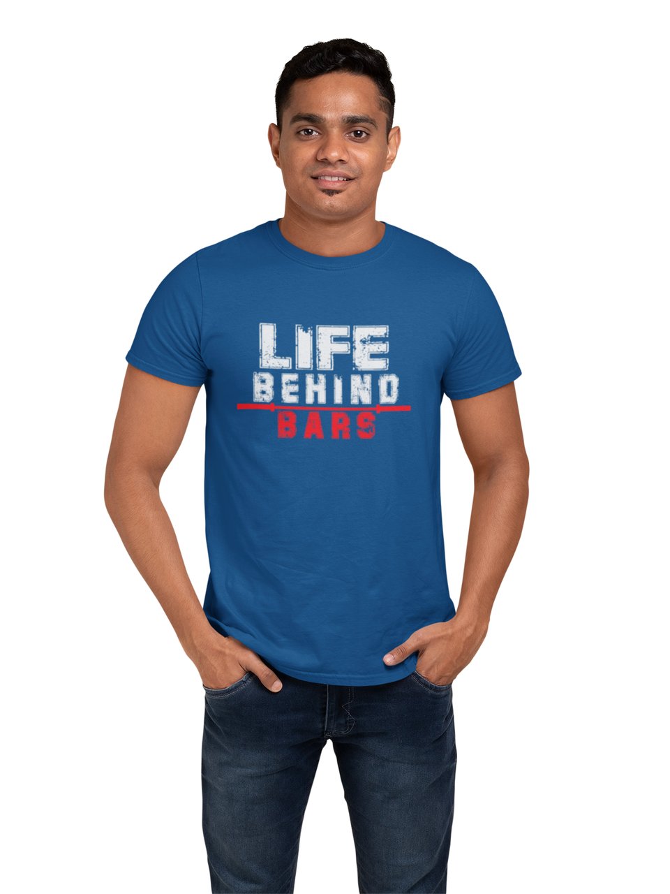 Life Behind Bars, Round Neck Gym Tshirt (BG Blue, Red) (Blue Tshirt) - Clothes for Gym Lovers - Suitable for Gym Going Person - Foremost Gifting Material for Your Friends and Close Ones