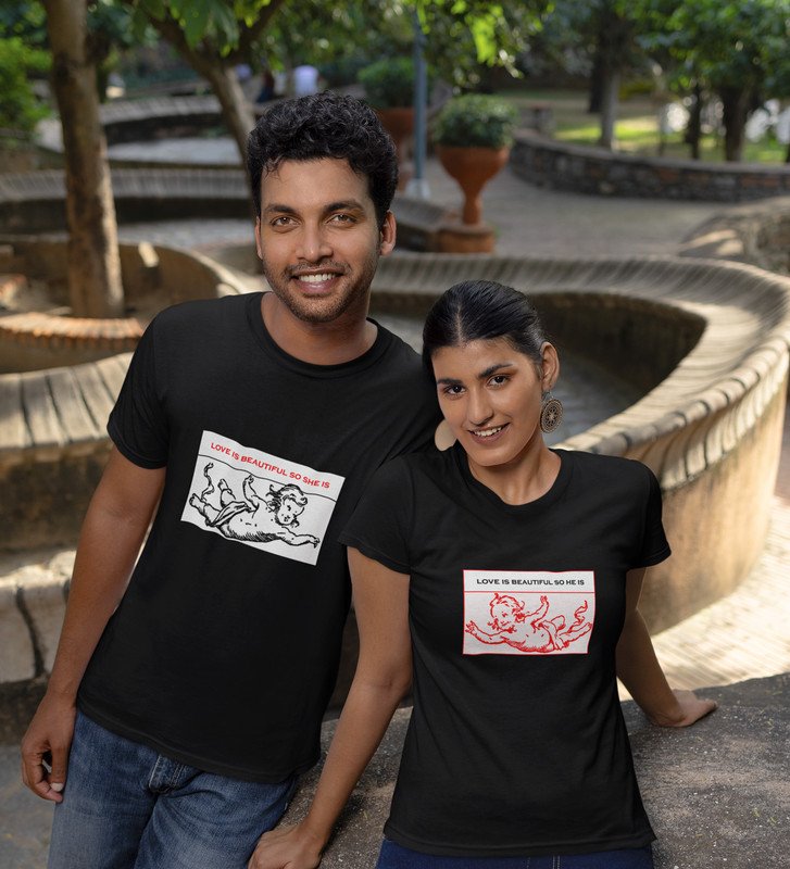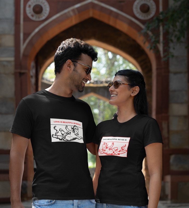 Love Is Beautiful So She Is/ Love Is Beautiful So He Is, Printed (Black) T-Shirts For Couples