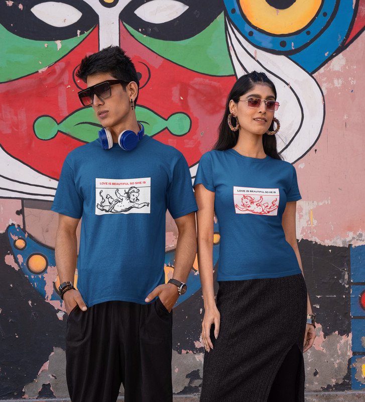 Love Is Beautiful So She Is/ Love Is Beautiful So He Is, Printed (blue) T-shirts For Couples
