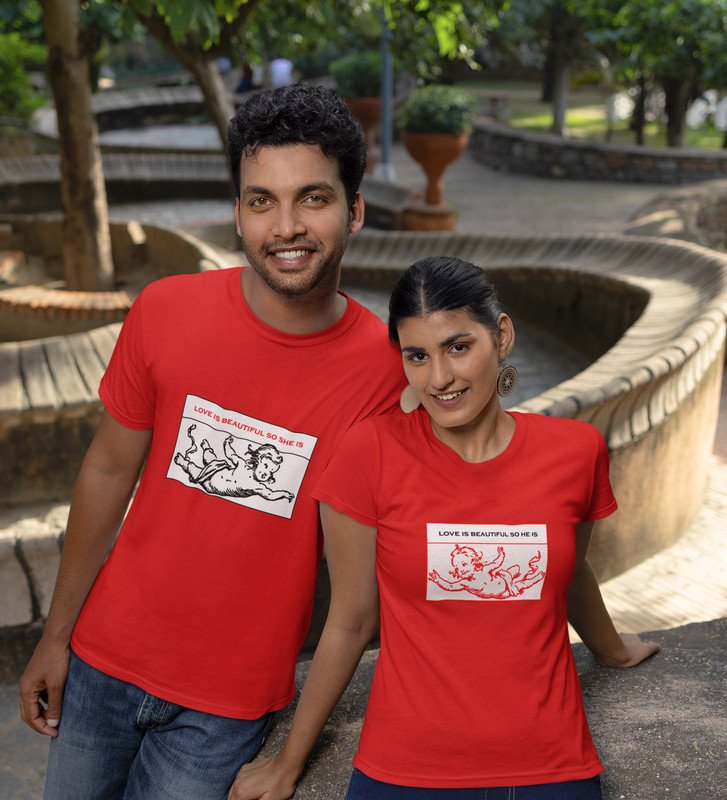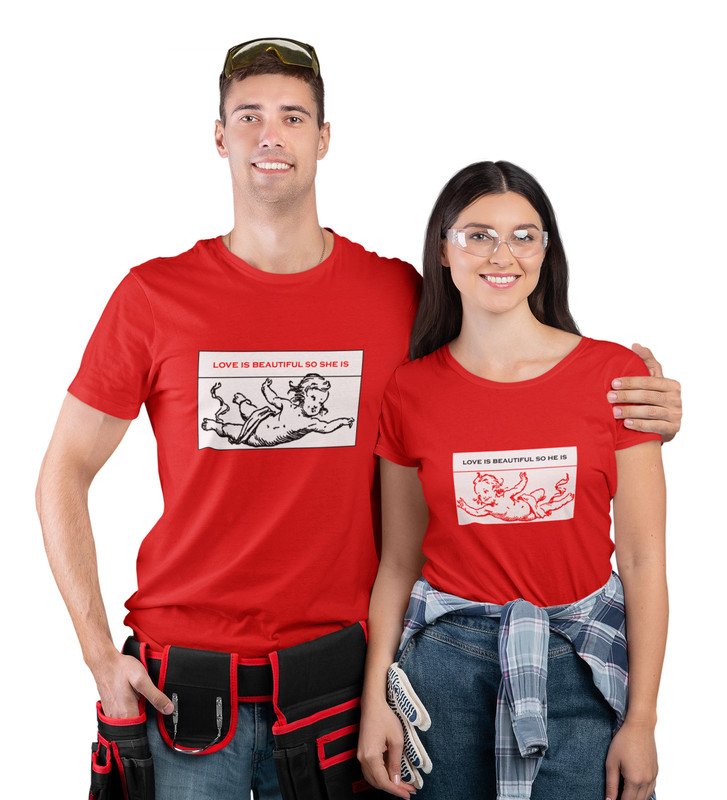 Love Is Beautiful So She Is/ Love Is Beautiful So He Is, Printed (Red) T-shirts For Couples