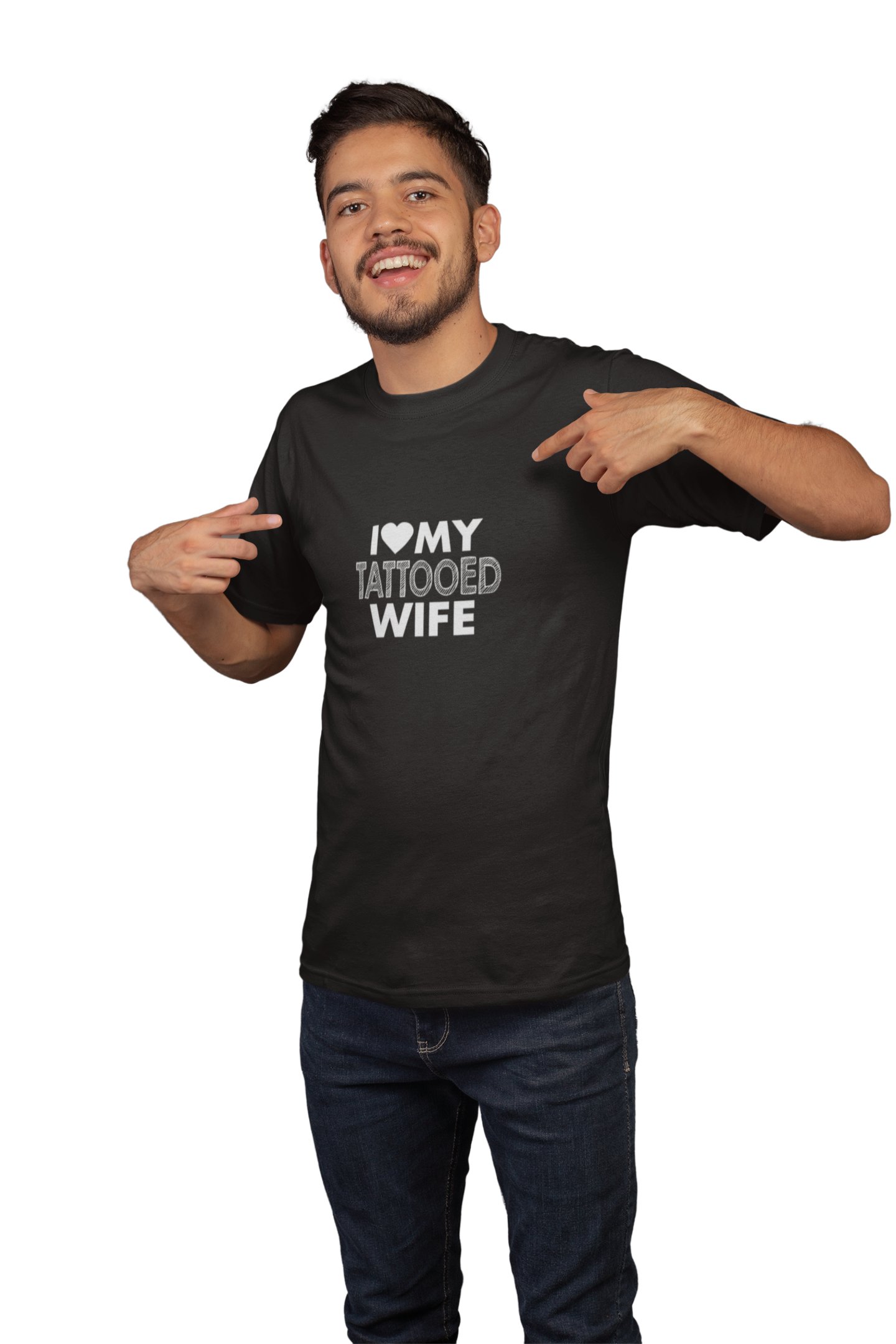Love my tattoed wife(Shaded text) -printed family themed cotton blended half-sleeve t-shirts made for men (black)