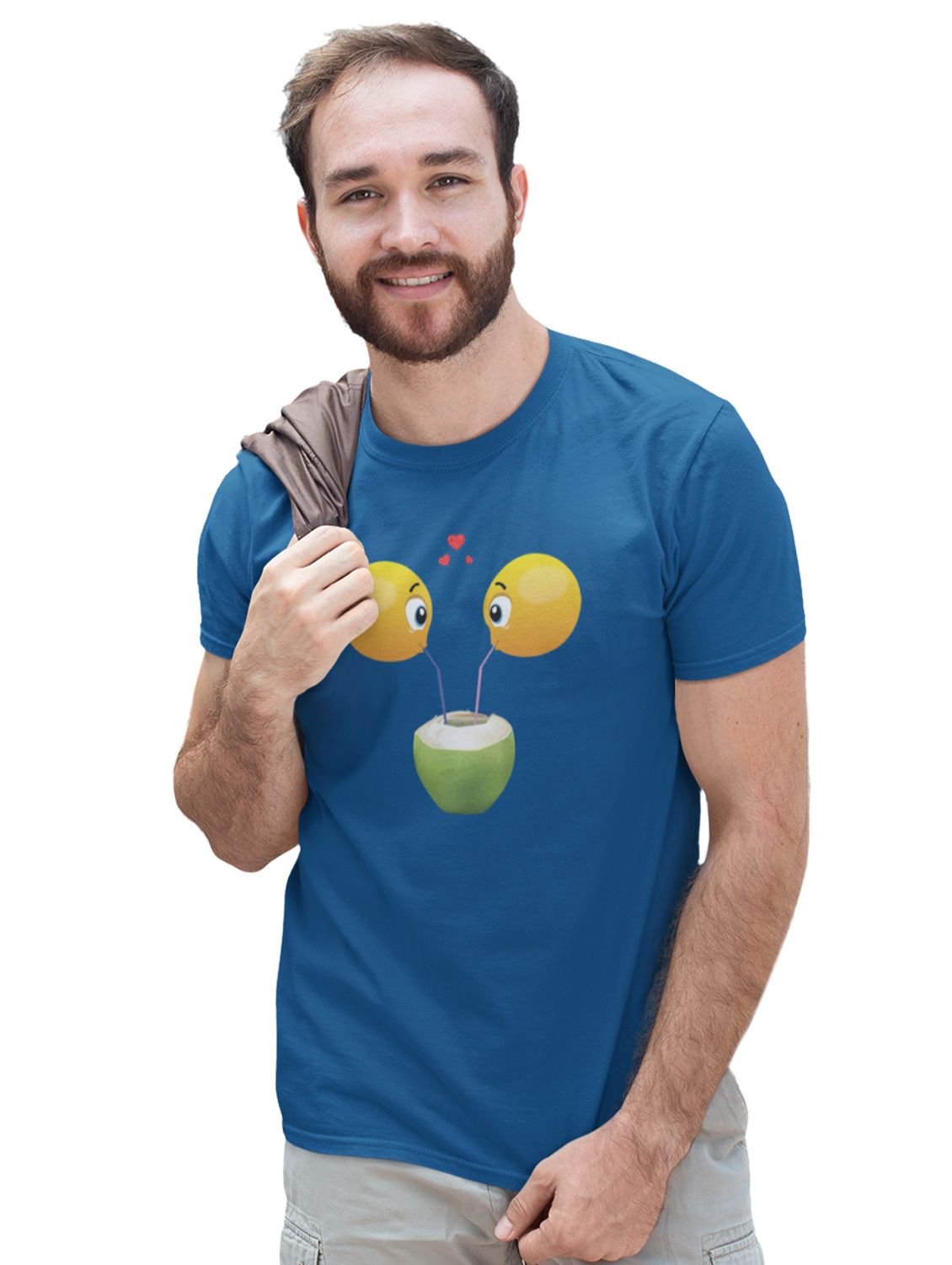 Loveable Emoji Couple Drinking Coconut Water Printed T-shirt (Blue) - Clothes for Emoji Lovers - Suitable for Fun Events - Foremost Gifting Material for Your Friends and Close Ones