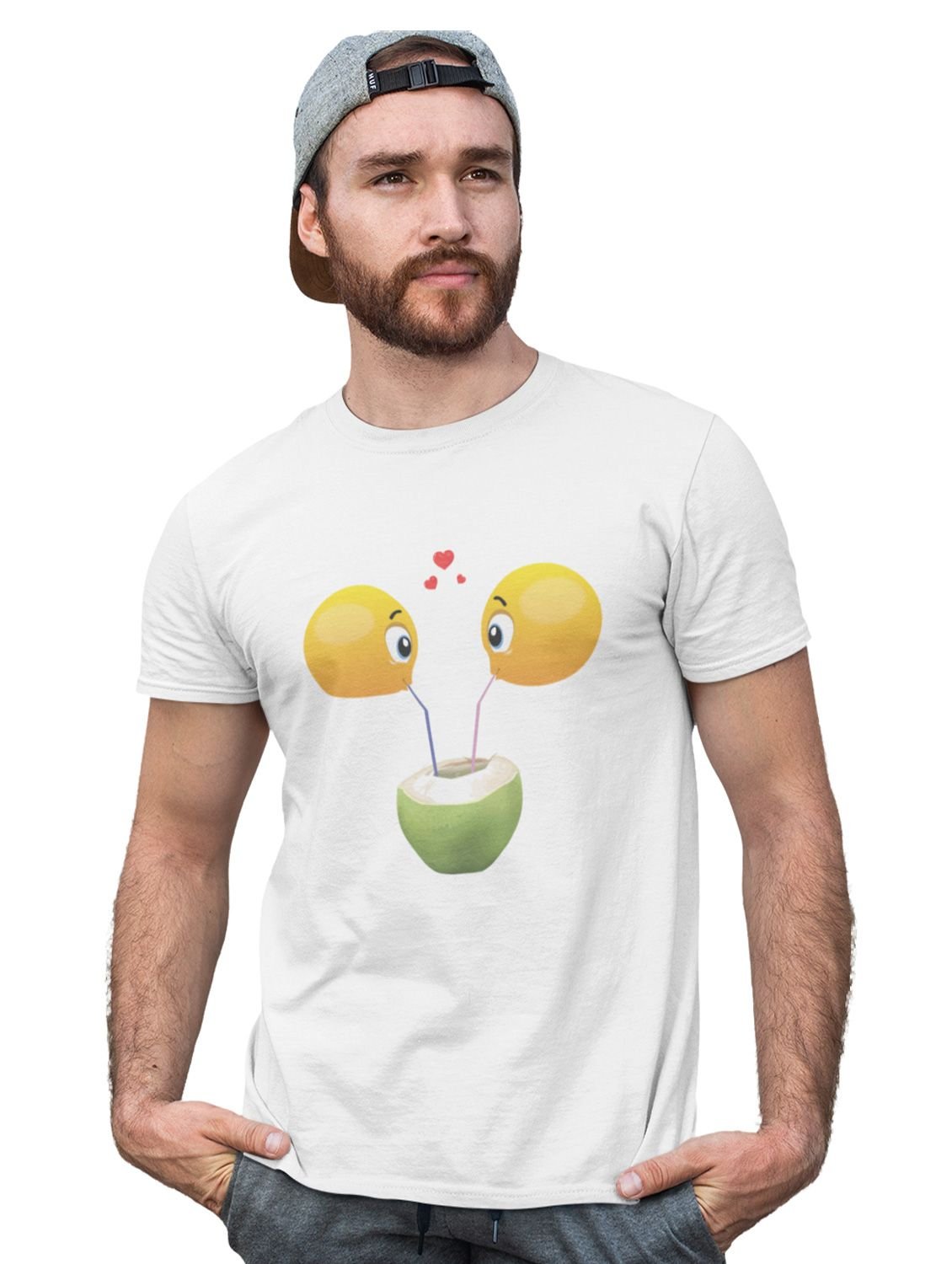 Loveable Emoji Couple Drinking Coconut Water Printed T-shirt (White) - Clothes for Emoji Lovers -Foremost Gifting Material for Your Friends and Close Ones