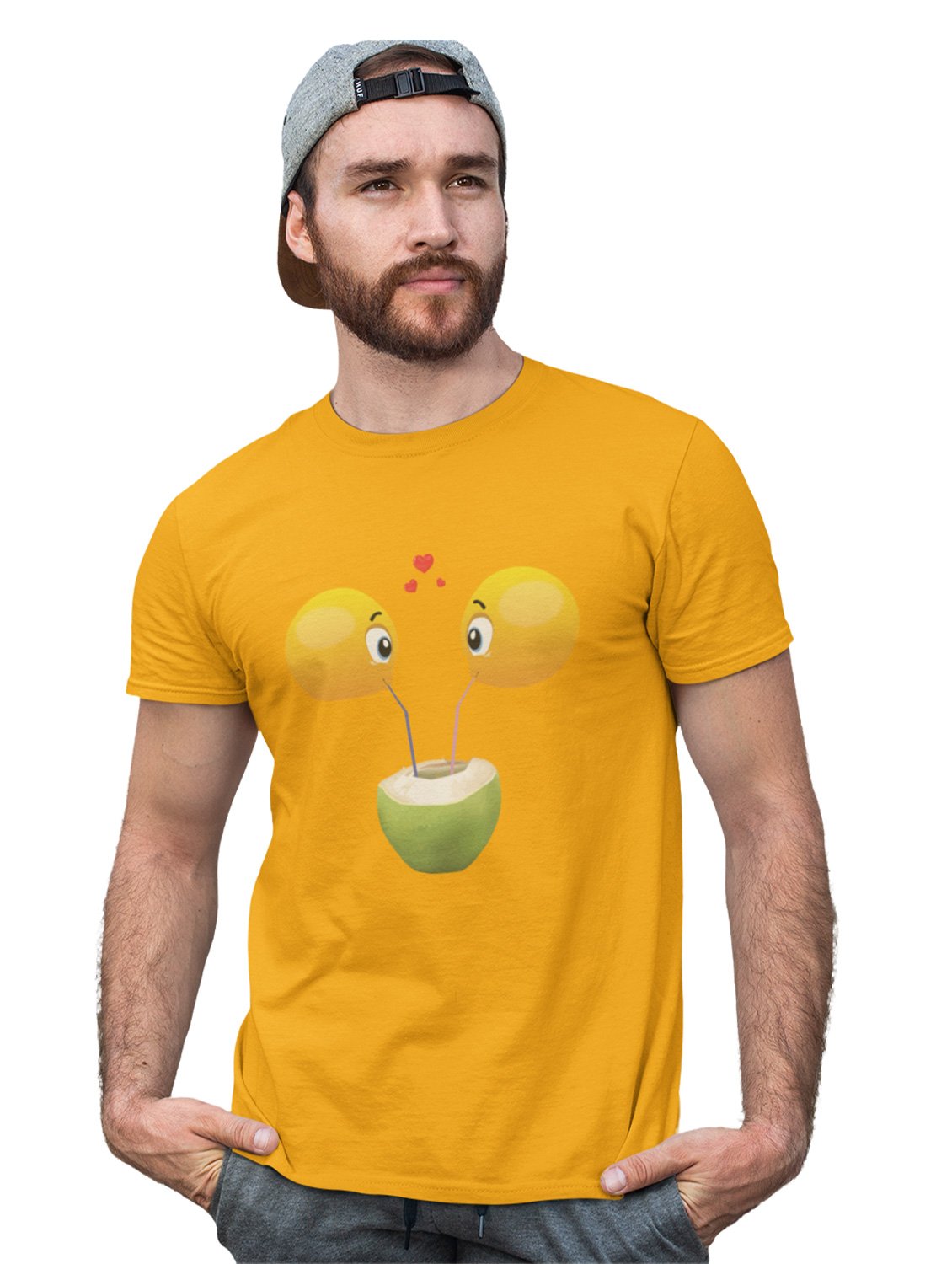 Loveable Emoji Couple Drinking Coconut Water Printed T-shirt (Yellow) - Clothes for Emoji Lovers - Suitable for Fun Events - Foremost Gifting Material for Your Friends and Close Ones