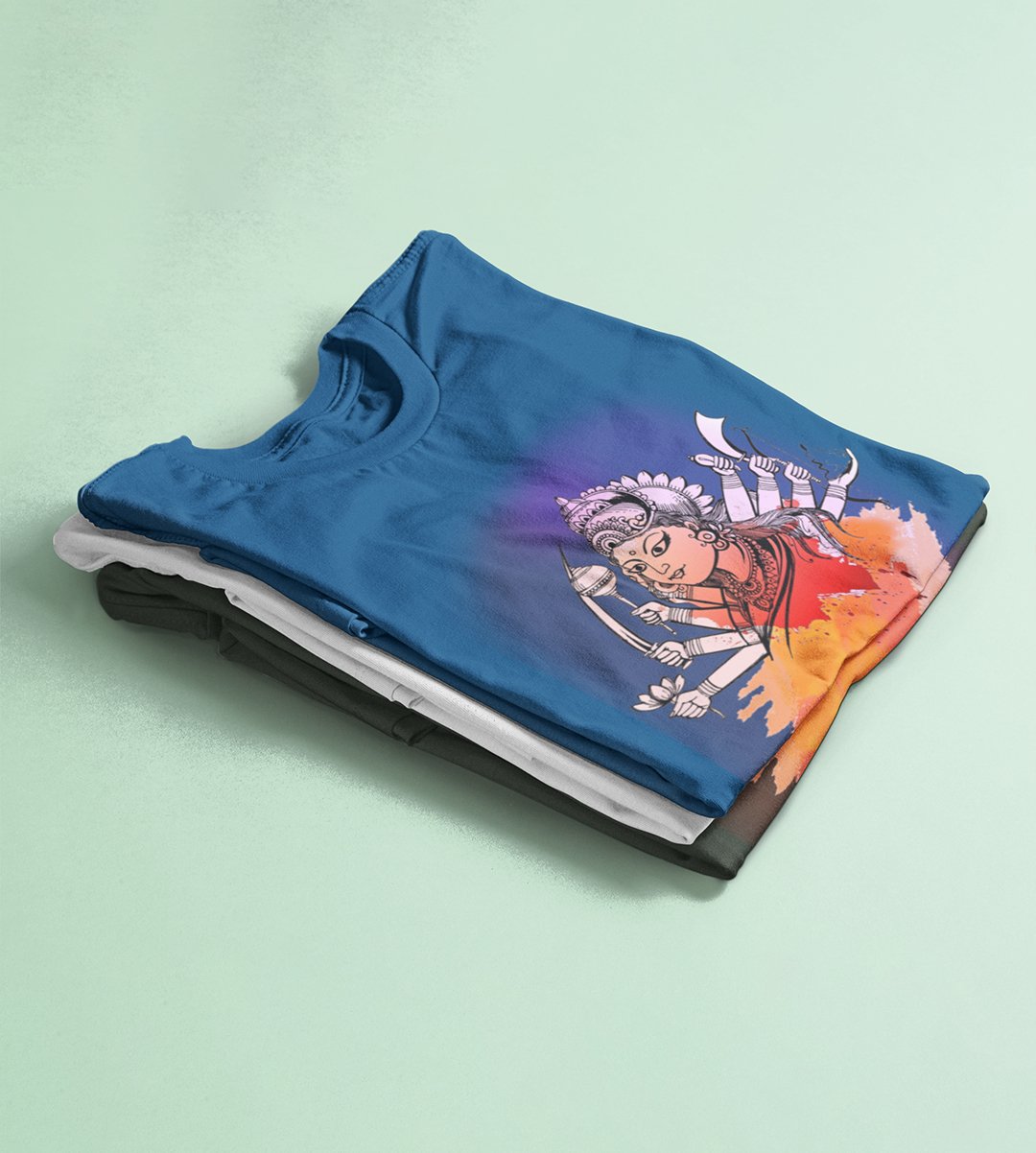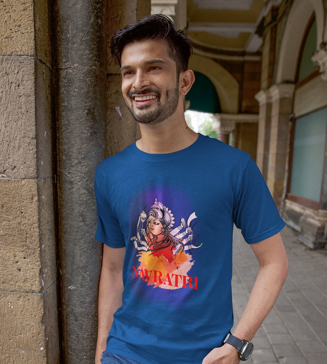 Navratri is a very auspicious festival for hindus. It takes place at the beginning of October and sometimes September. Enjoy the 9 days of festivities with full zeal and make yourself submerged in the love of Maa Durga. Navratri is also known as Durga Puja. And with this Tees, you can shine like a star during this festive season with our navratri themed cotton half sleeved Tshirts. You can pair our t-shirts with trousers and denim of your choice and make it a weekday smart casual or weekend wear. This is durable. This tshirt is smooth and soft which makes you comfortable to wear during all seasons. The printing in it is durable and odourless. It has five sizes, S,M,L,XL,XXL. The Tshirt colour is intact even after repeated washes. It can be kept in your wardrobe and hangers. Please avoid washing mashine to clean this Tee, it may affect the print. Hand wash only. We have brought you many navratri related designs printed on our different colour Tshirts to choose from. Grab it now.