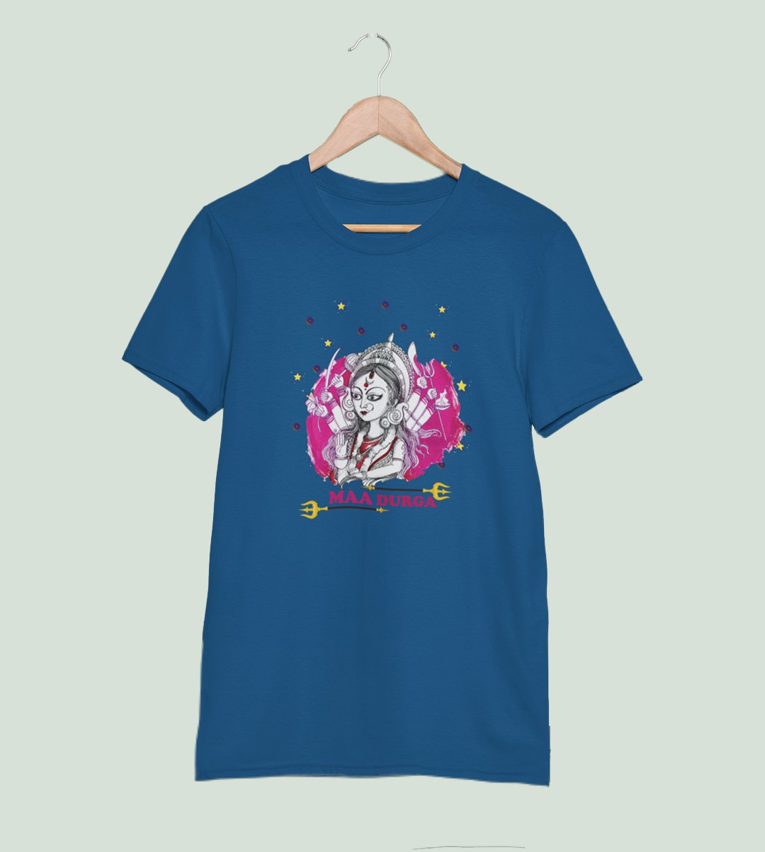 Maa durga potrait (BG pink) printed unisex adults round neck cotton half-sleeve blue tshirt specially for Navratri festival/ Durga puja