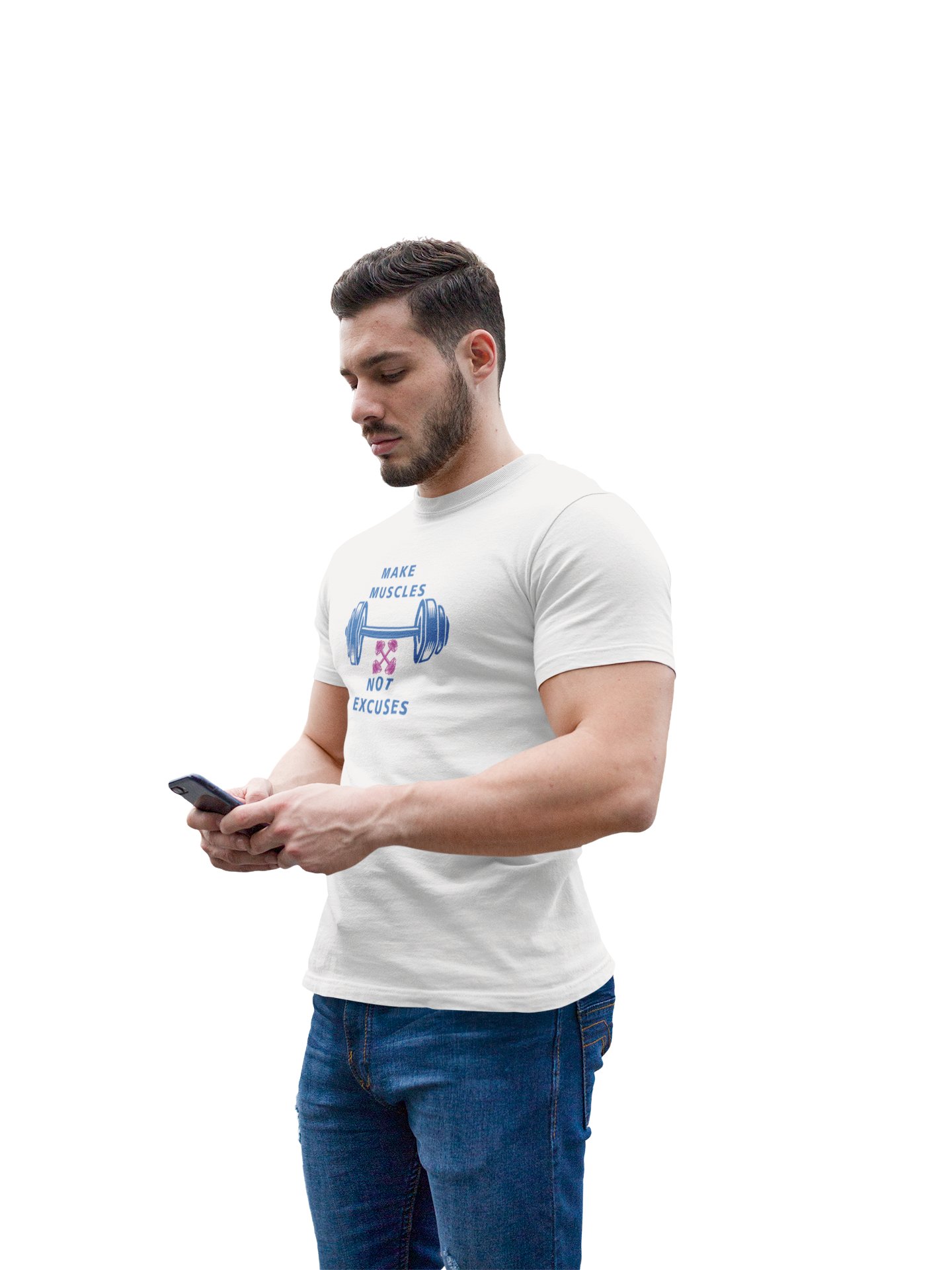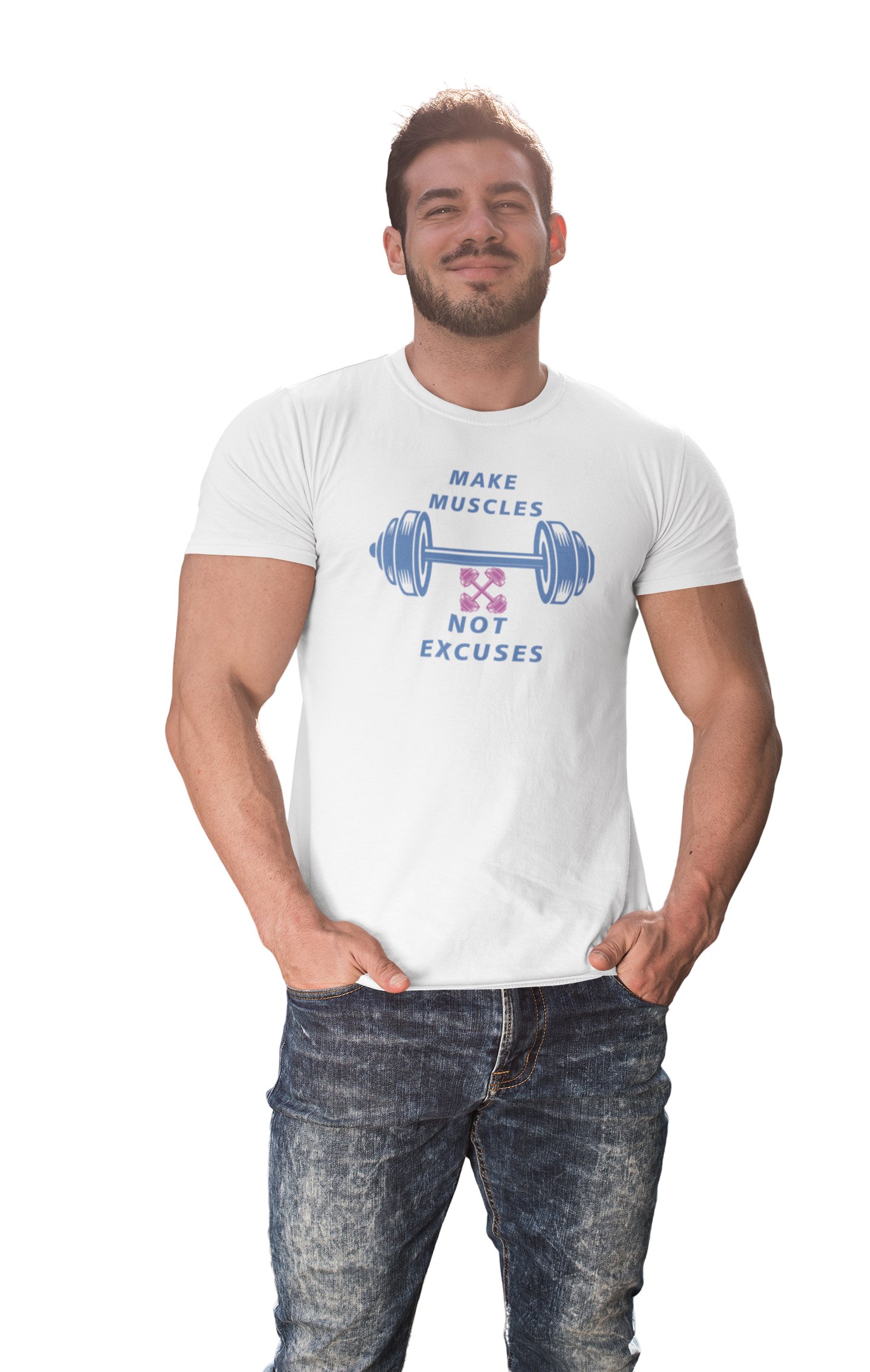 Make Muscles, Not Excuses, (BG White), Round Neck Gym Tshirt (White Tshirt) - Clothes for Gym Lovers - Suitable for Gym Going Person - Foremost Gifting Material for Your Friends and Close Ones