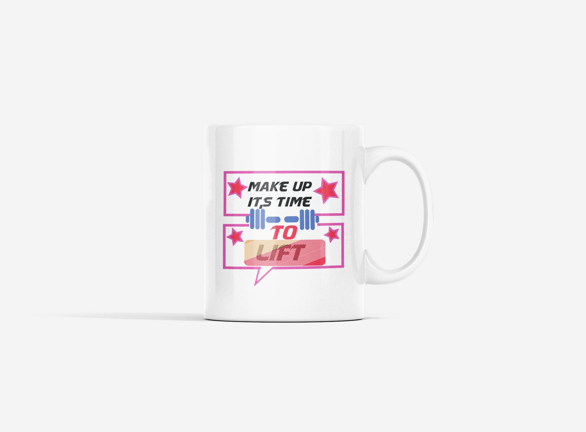 Makeup, Its Time To Lift - gym themed printed ceramic white coffee and tea mugs/ cups for gym lovers