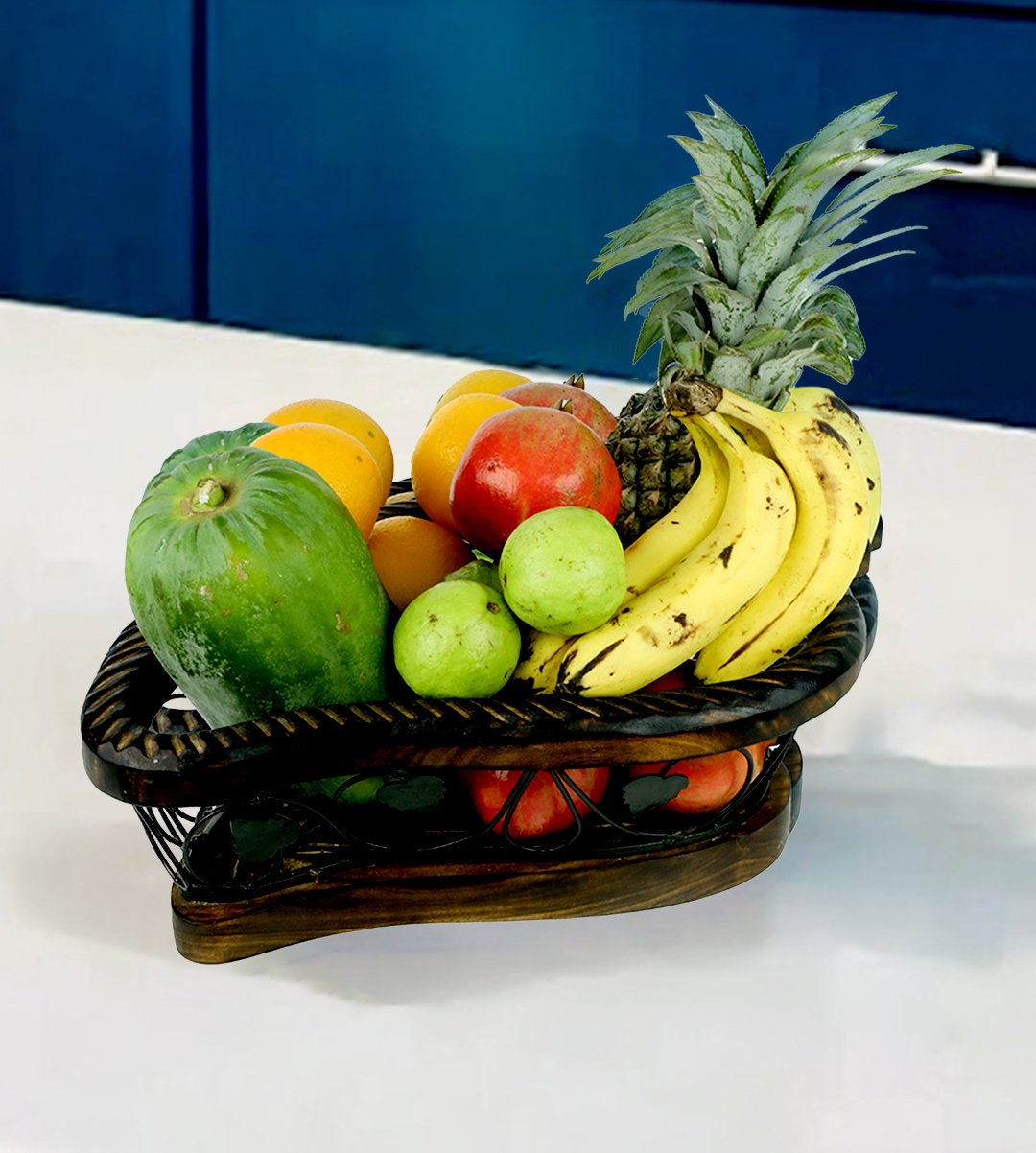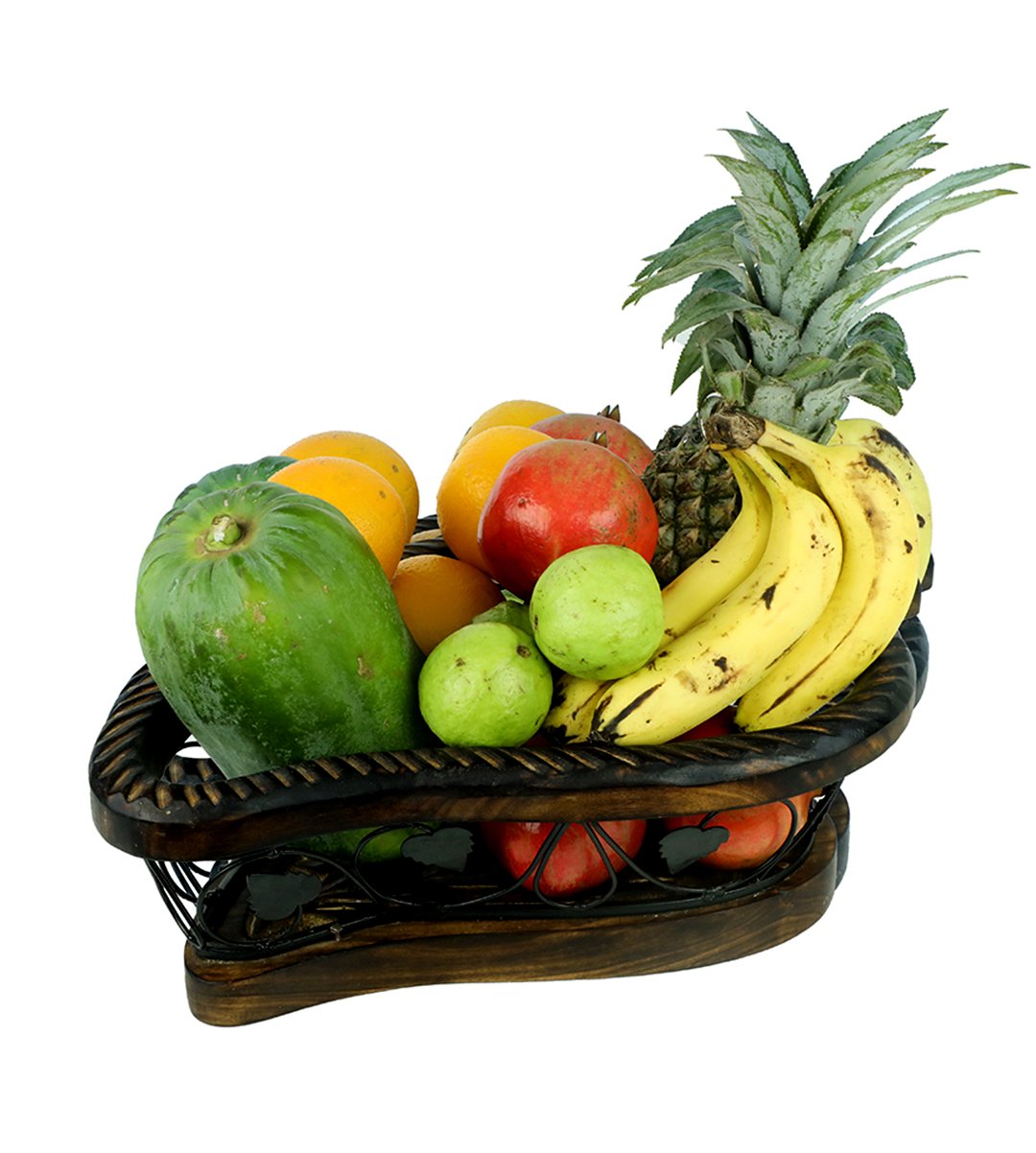 The mango shaped wooden and wrought iron fruit and vegetable basket, fruit vessel, or a fruit container is used to keep both fruits and vegetables in it. It is tangled with every detailing of the product, carryable and its mango shape design looks classy. It is used to keep in dining table and center table. The product is made up from wrought iron and wood. The designs enhancing the product into a classified one. It has best finishing. You must have your favourite one. We have brought you many fruit and vegetable containers to choose from. You can gift it to your family, relatives, friends, siblings. Also it can be gifted in birthdays, marriages, anniversaries, house warming parties, christmas parties, kitty parties etc. Grab it as soon as possible.