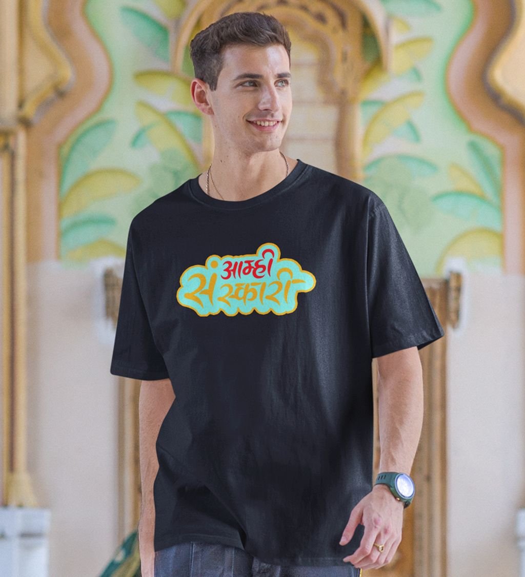 Marathi Masti Black Round Neck Cotton Half Sleeved Men T Shirt with Printed Graphics