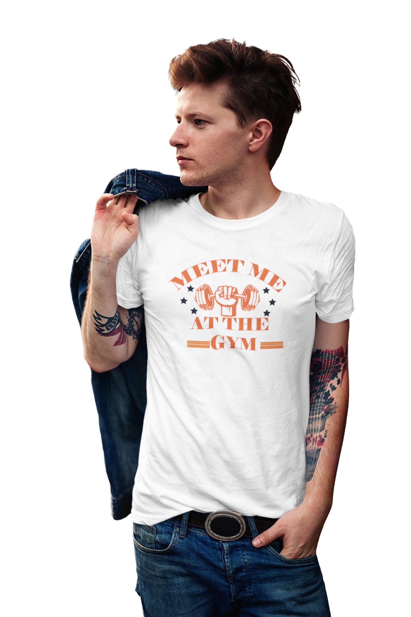 Meet Me At The Gym, (BG Orange), Round Neck Gym Tshirt (White Tshirt) - Clothes for Gym Lovers - Suitable for Gym Going Person - Foremost Gifting Material for Your Friends and Close Ones