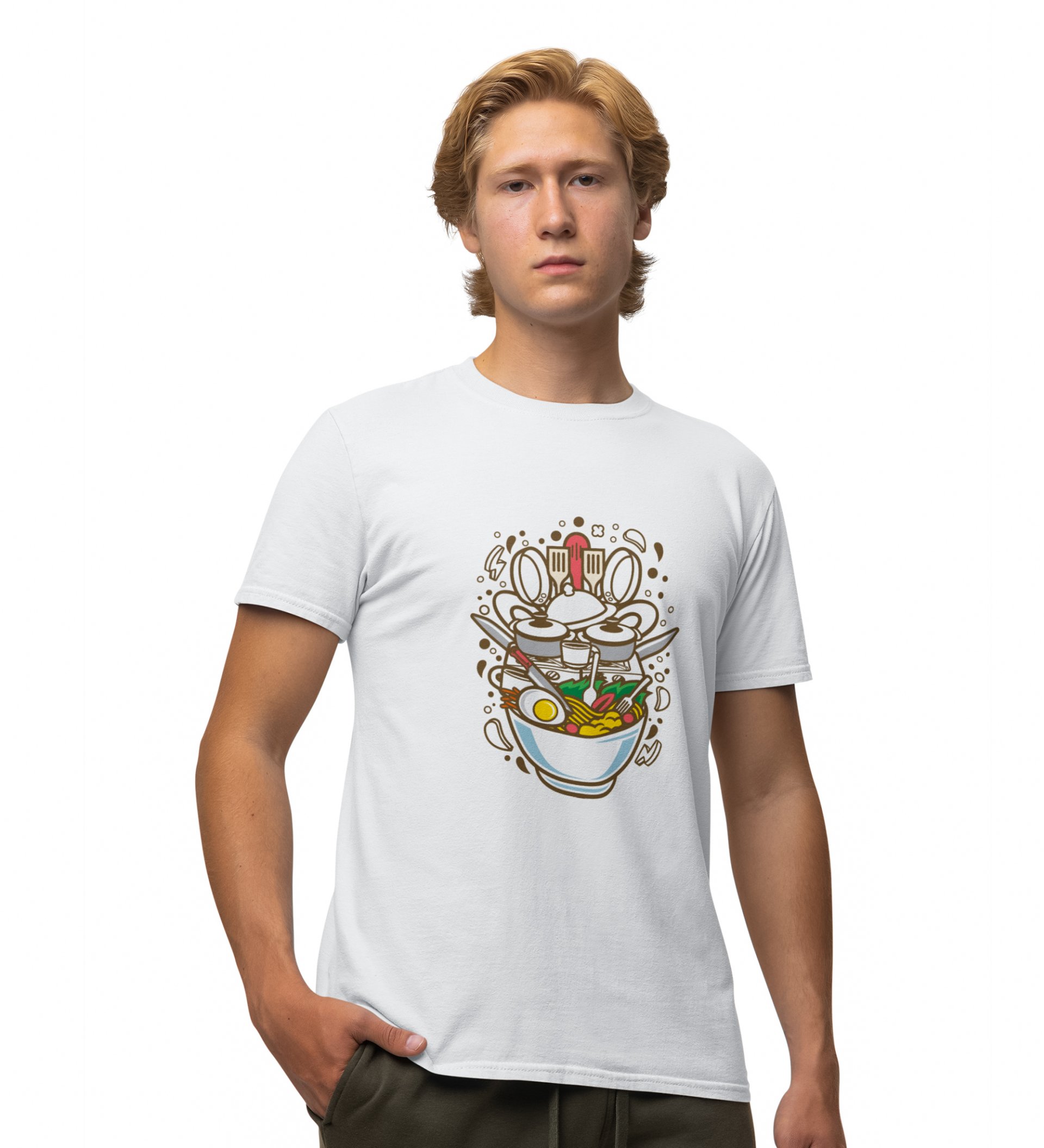 Messy Ramen White Round Neck Cotton Half Sleeved Men's T-Shirt with Printed Graphics