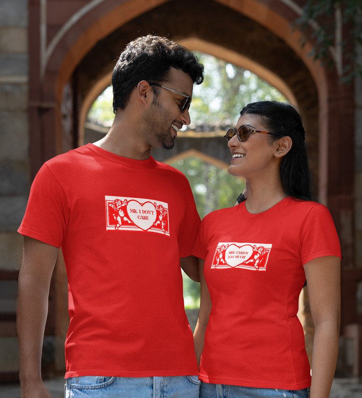 Mr Cares Too Much/ Mrs I Don't Care, Printed (Red) T-shirts For Couple