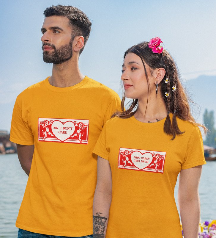 Mr Cares Too Much/ Mrs I Don't Care, Printed (Yellow) T-shirts For Couple