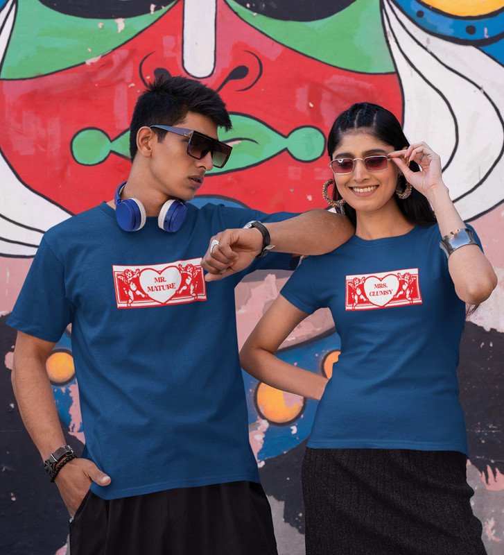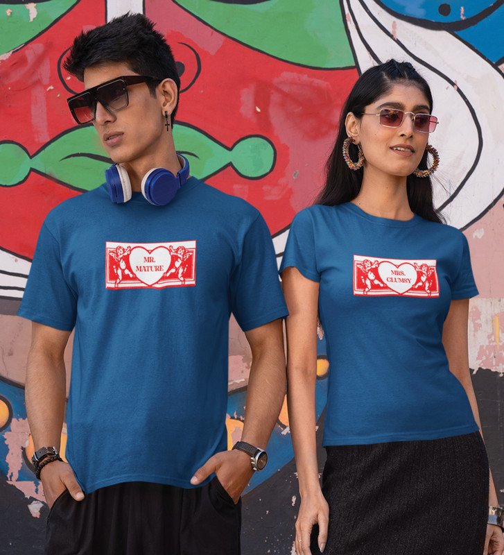 Mr Mature/Mrs Clumsy (blue) T-shirts Printed For Couples