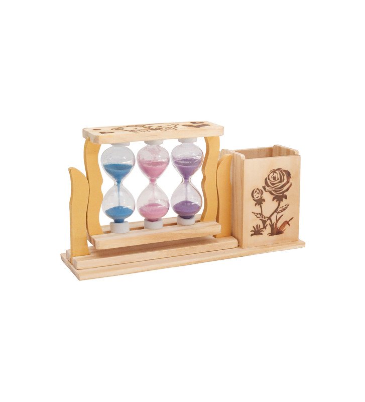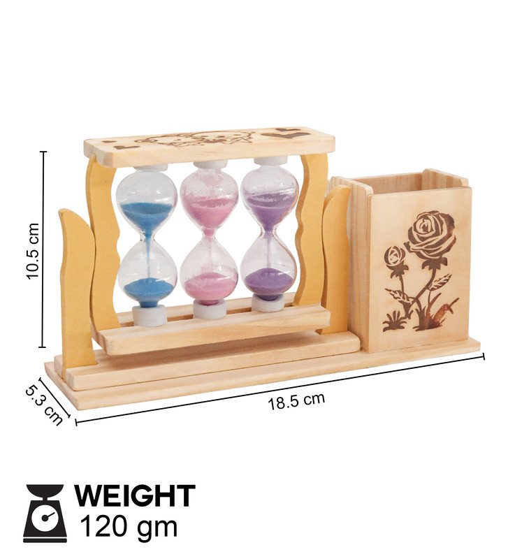 Multi-Colour Wooden Three Hourglass Timer Pen Stand/Pencil Stand for Office Decorative Showpiece