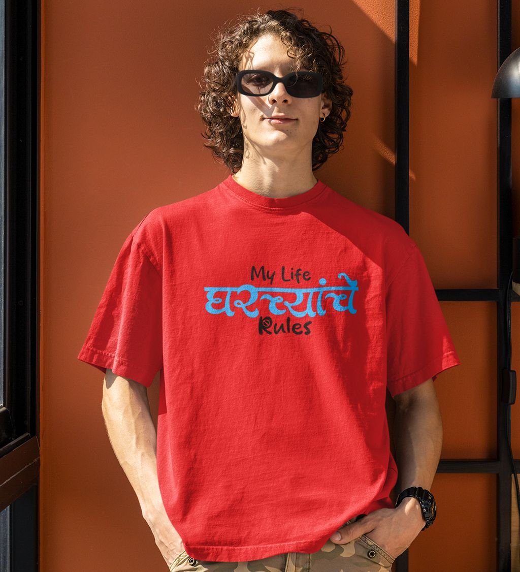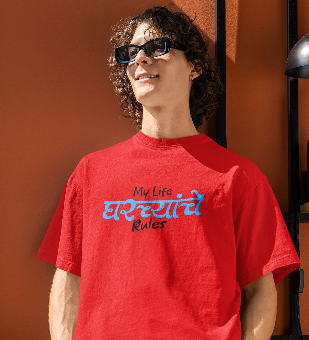 My Life Family Rules Red Round Neck Cotton Half Sleeved Mens T Shirt with Printed Graphics