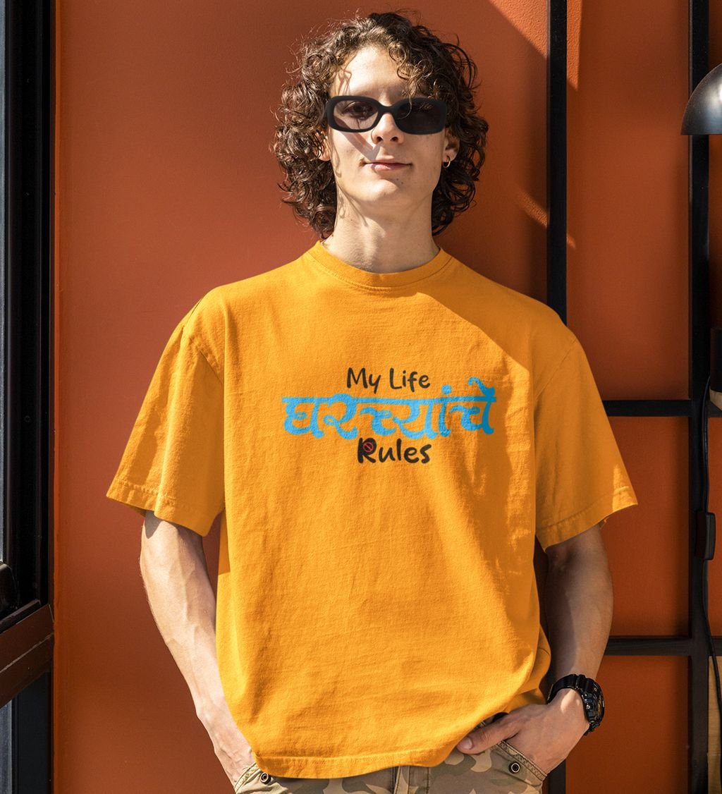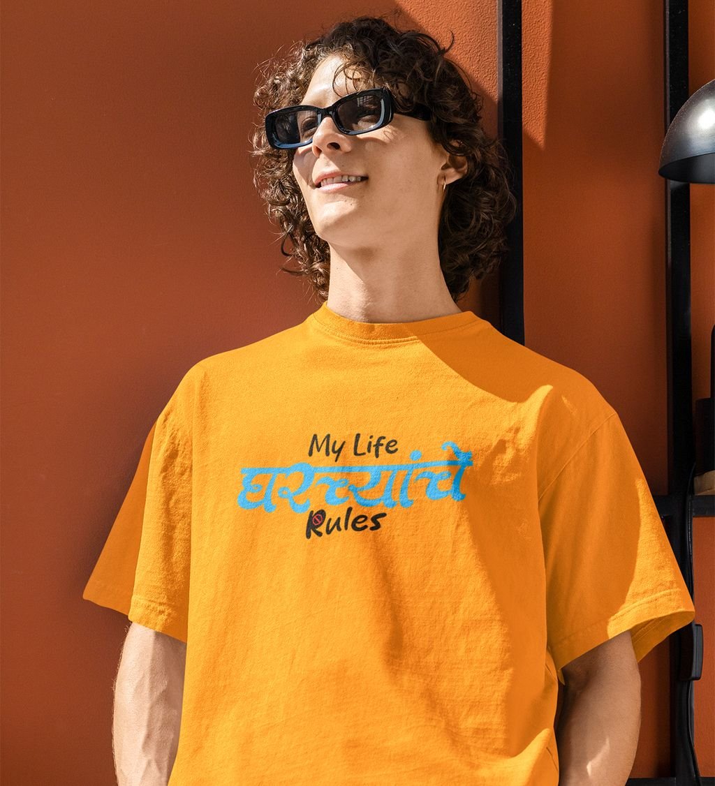 My Life Family Rules Yellow Round Neck Cotton Half Sleeved Mens T Shirt with Printed Graphics