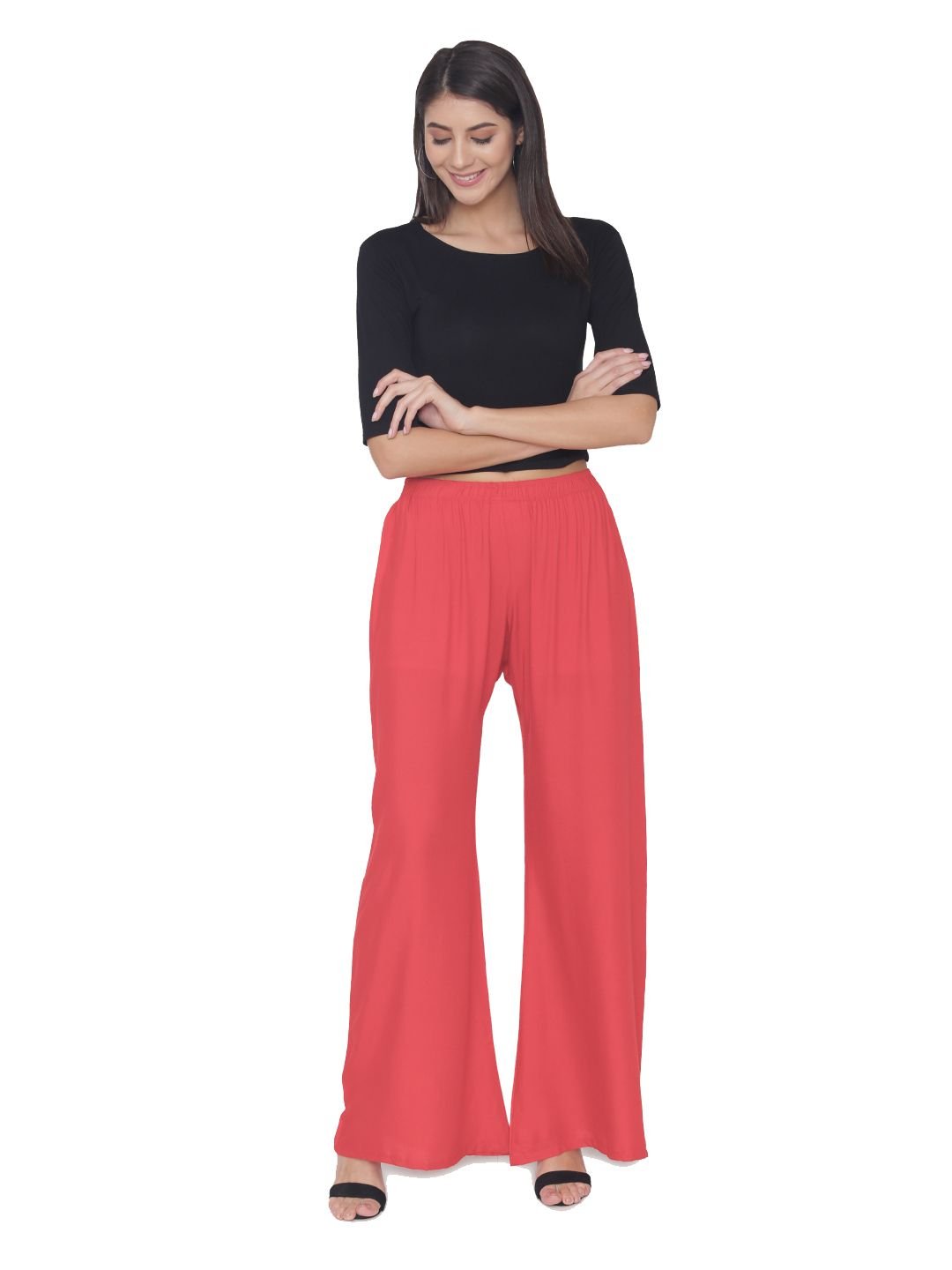 N-Gal Rayon Women's Wide Leg Elastic Waist Band Breathable Plain Palazzo Pant_Coral