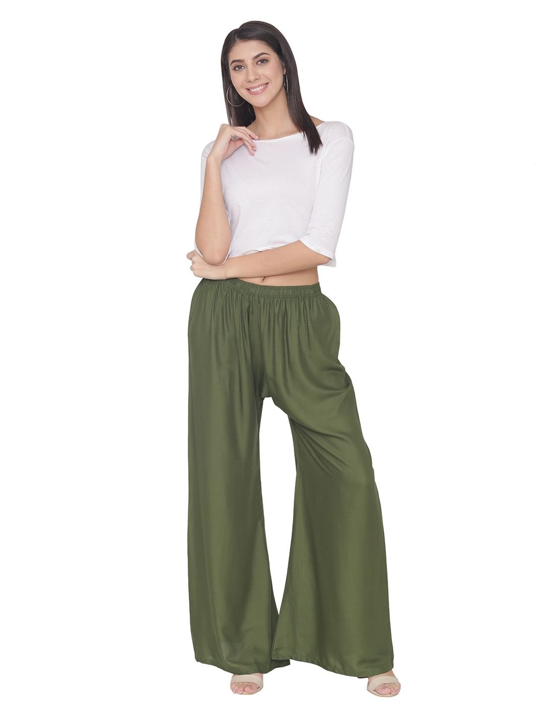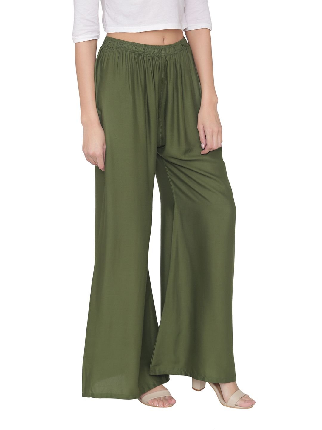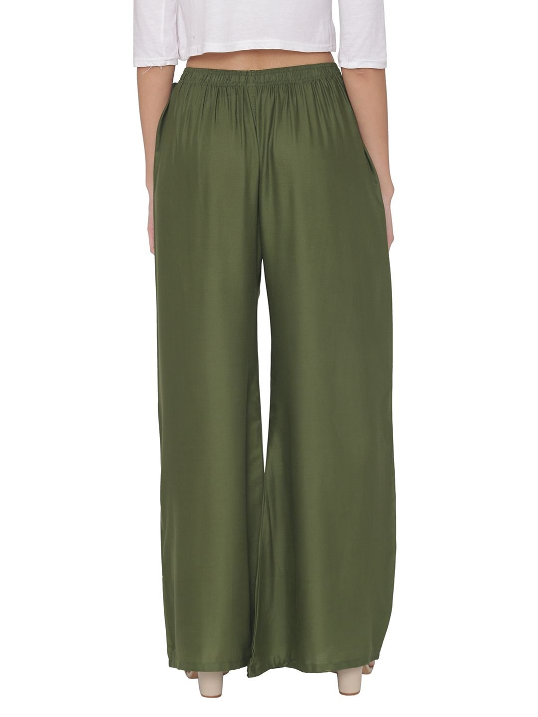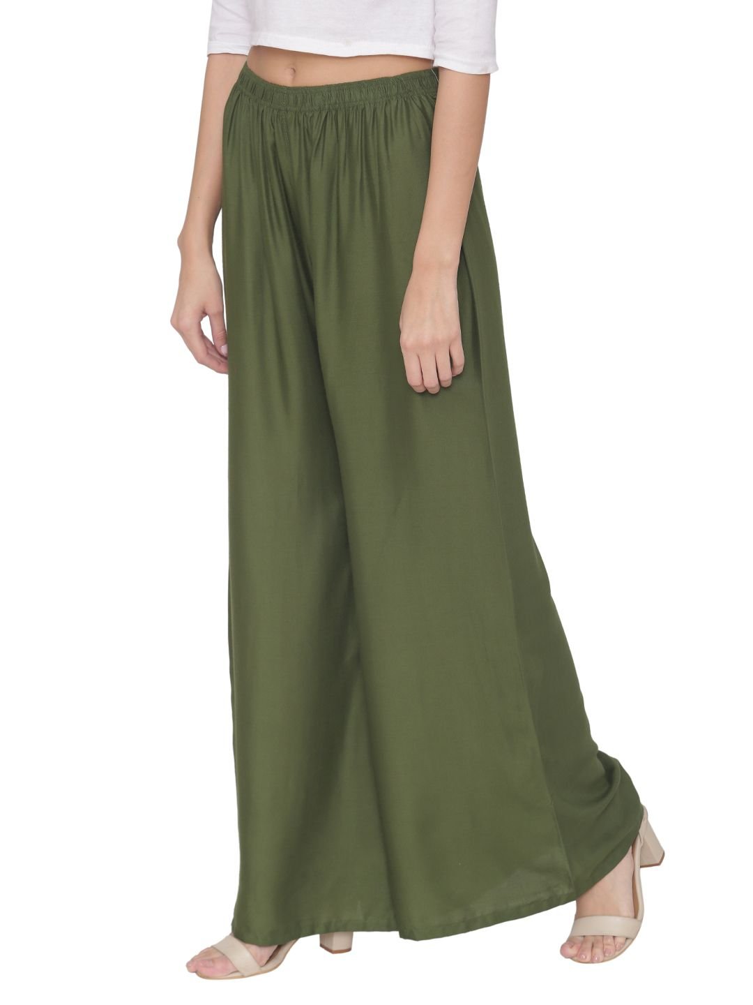 N-Gal Rayon Women's Wide Leg Elastic Waist Band Breathable Plain Palazzo Pant_Mehendi