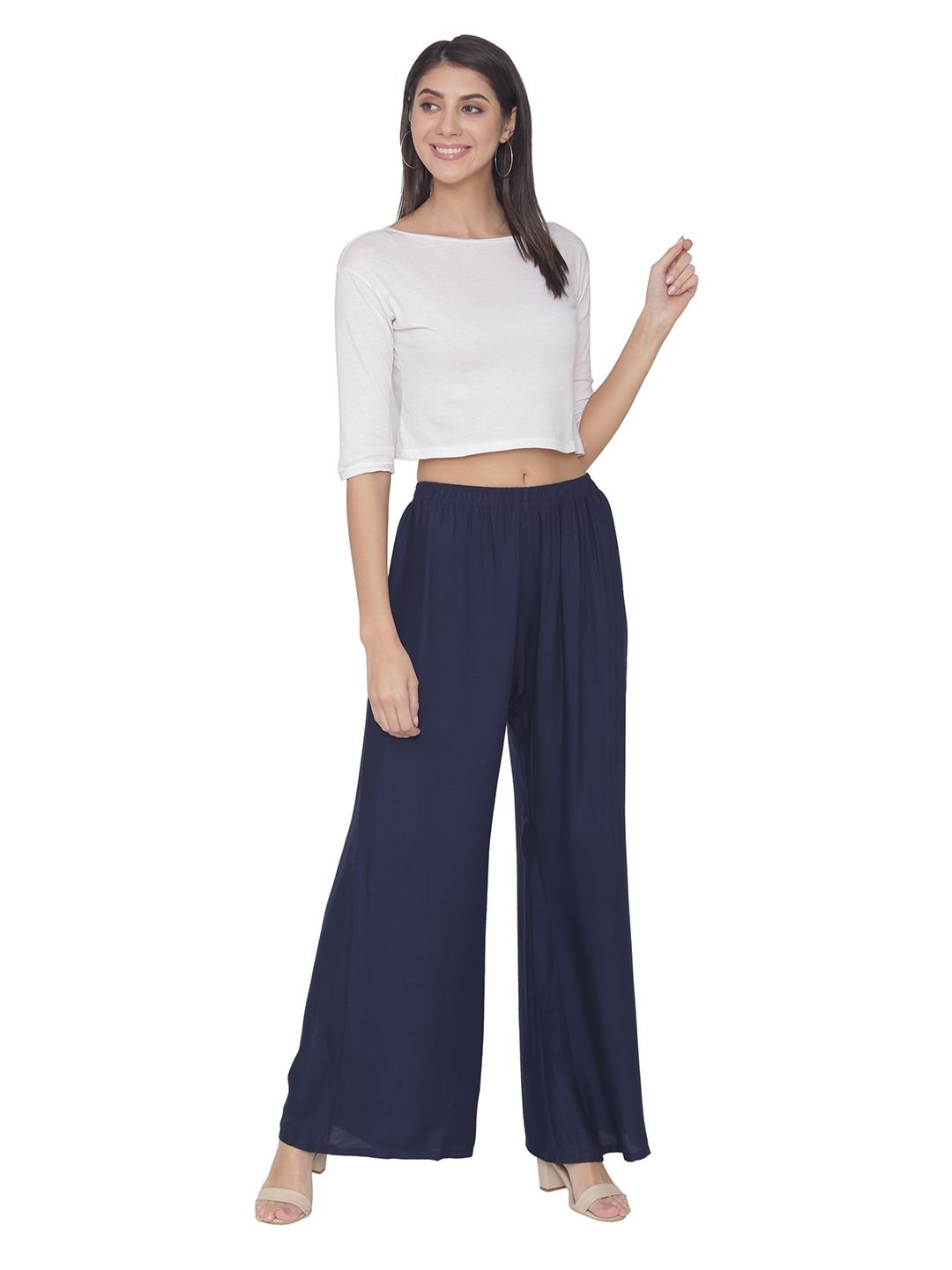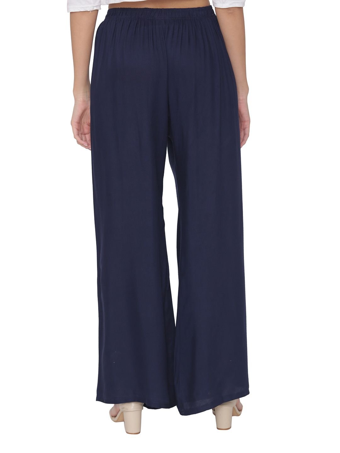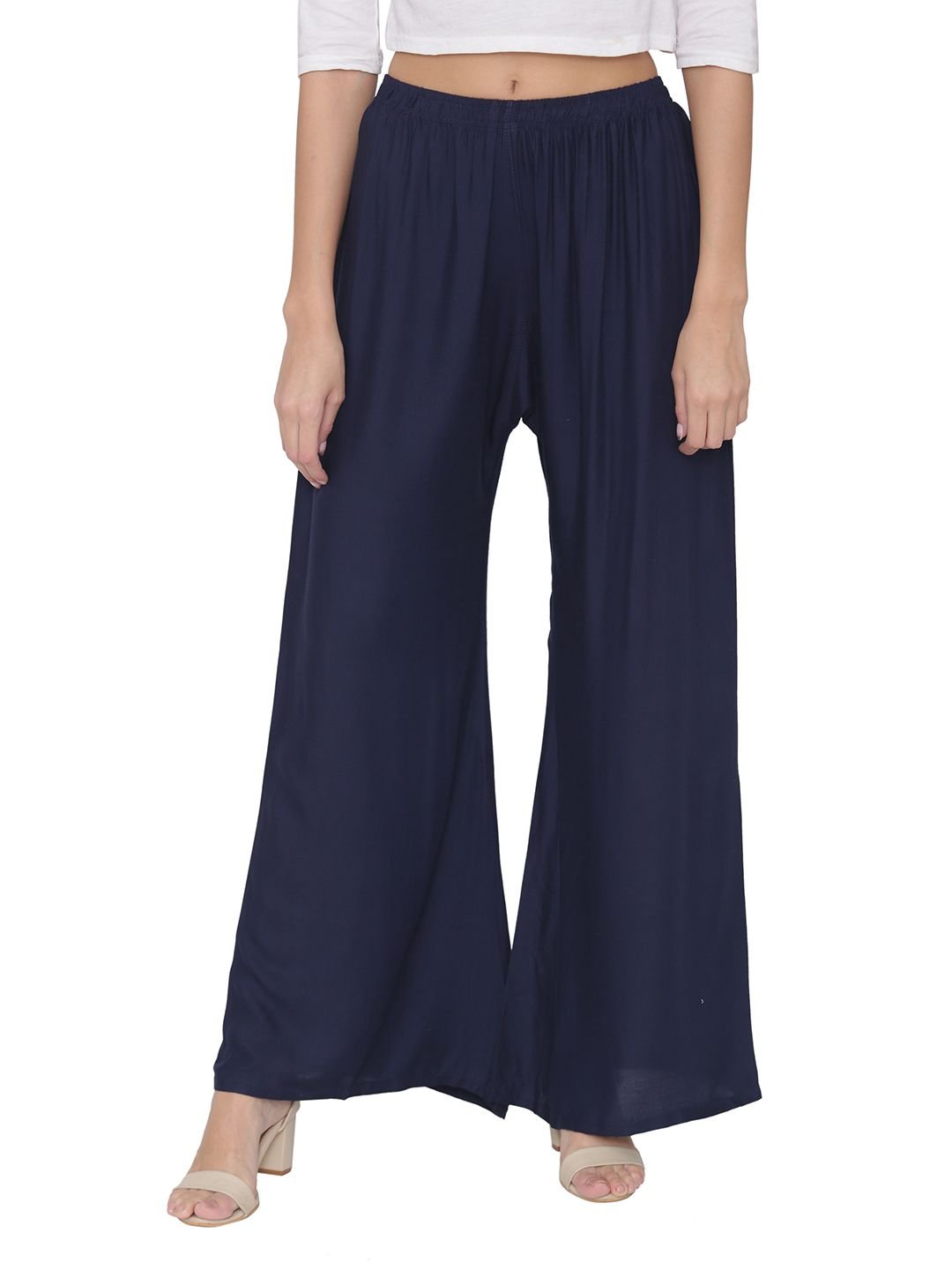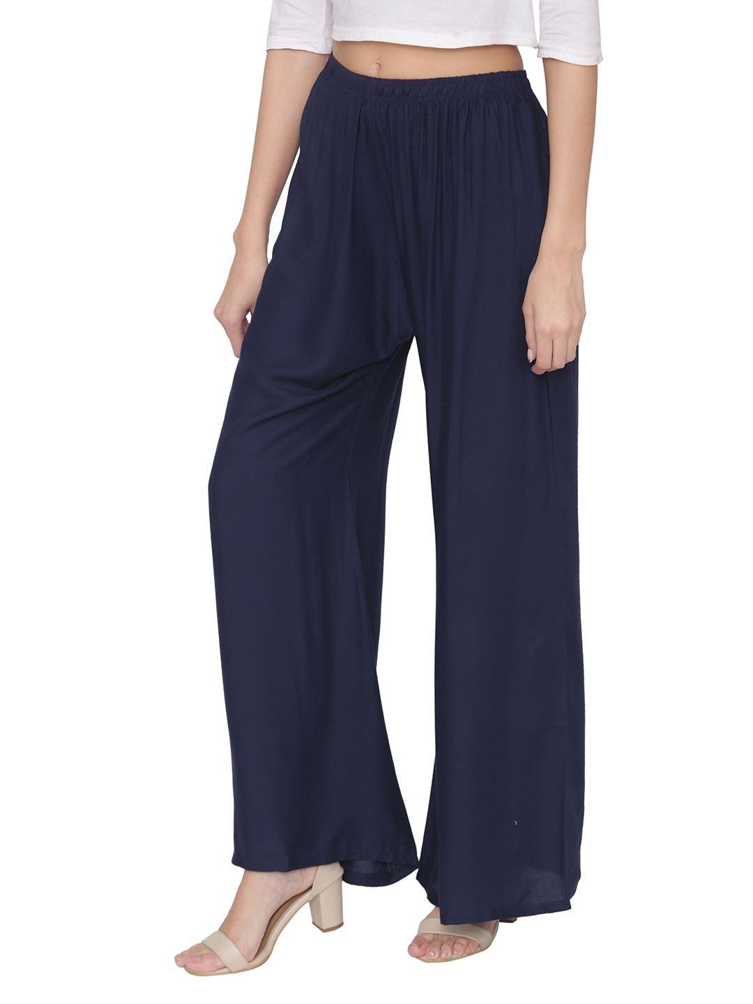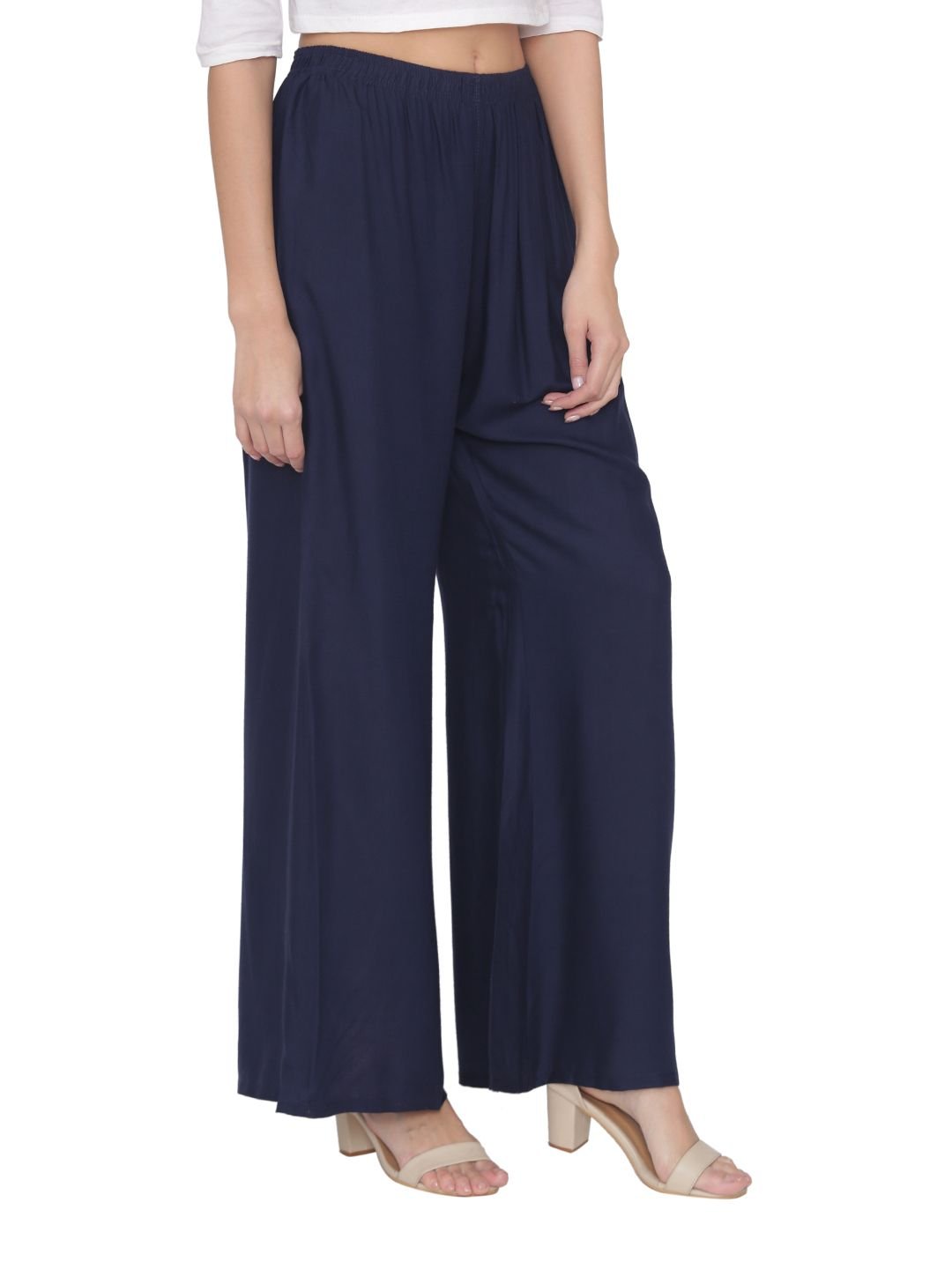 N-Gal Rayon Women's Wide Leg Elastic Waist Band Breathable Plain Palazzo Pant_NavyBlue