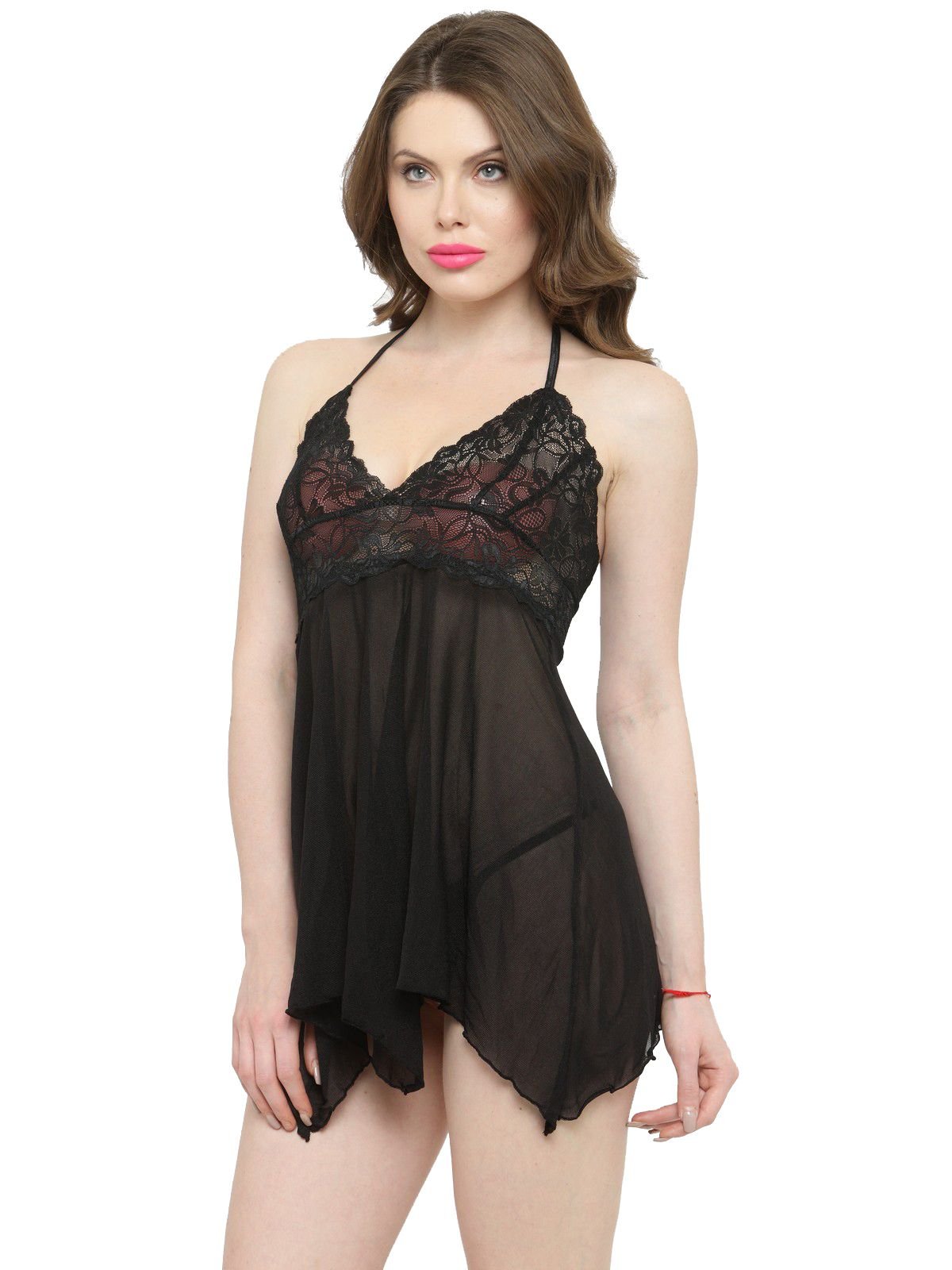 This gorgeous babydoll is a multi-fibre dress with halter-neck. It has gently waist-slimming back which is tied with a bow and the bust is held with embroidered stretch lace, whilst the skirt below flows in chiffon. The ensemble includes matching G-string. Mesh Babydoll Dress Highly Comfortable Includes: Dress , G-String