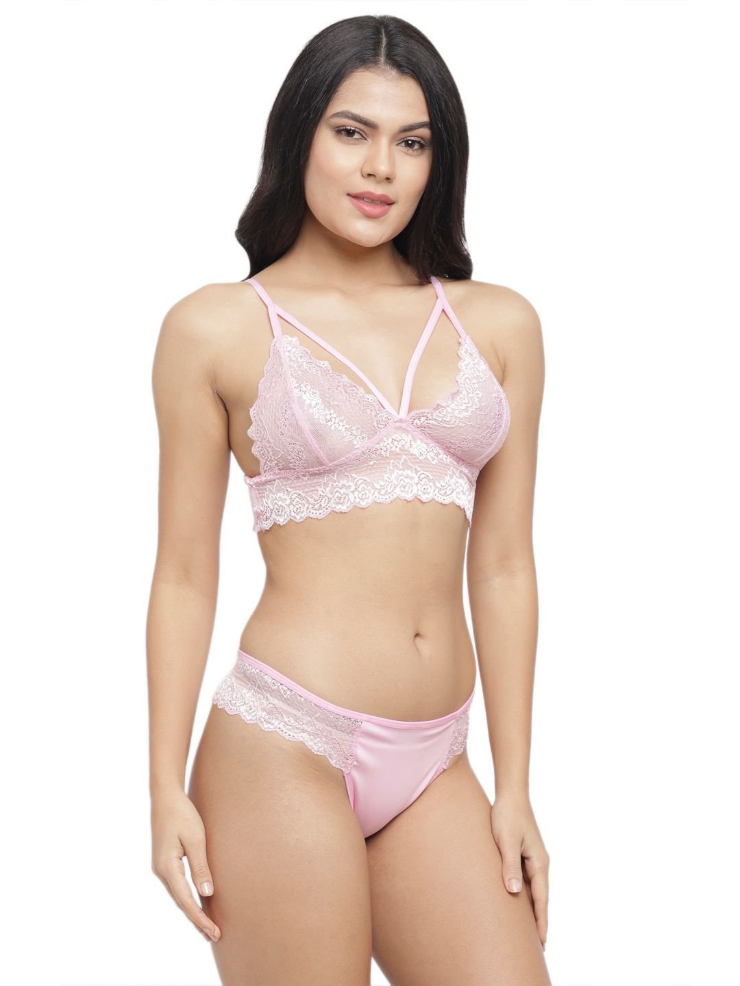 Set of lace bra Non-padded non wired lace bra with a deep neckline. Matching low waist panty lace cups,adjustable halterneck strap,back closure and matching lace thong panty with cutout and strap detail.These are skin friendly inner wears lovely set of double strap back bra and crotchless g-string thong low rise panty has delicate lace embellishment.