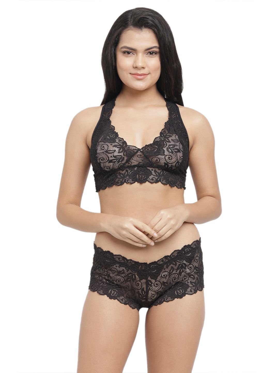 Set of lace bra Non-padded non wired lace bra with a deep neckline. Matching low waist panty lace cups,adjustable halterneck strap,back closure and matching lace thong panty with cutout and strap detail.These are skin friendly inner wears lovely set of double strap back bra and crotchless g-string thong low rise panty has delicate lace embellishment.