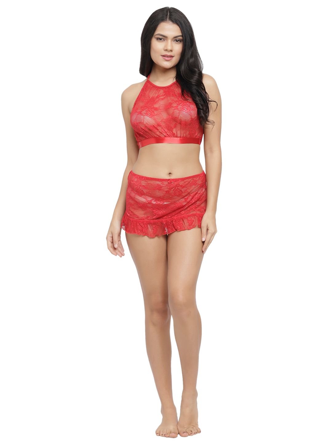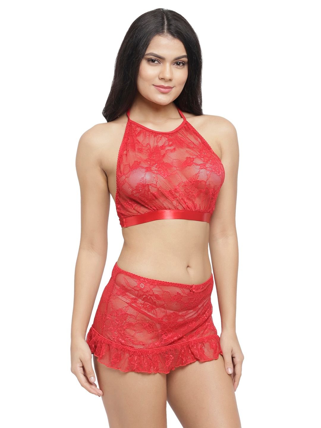 Set of lace bra Non-padded non wired lace crop top bra with a high neckline. Matching mini skirt,lace cups,adjustable halterneck strap,back closure and matching lace g-string panty.These are skin friendly inner wears lovely set of crop top bra and lace skirt g-string thong low rise panty has delicate lace embellishment.
