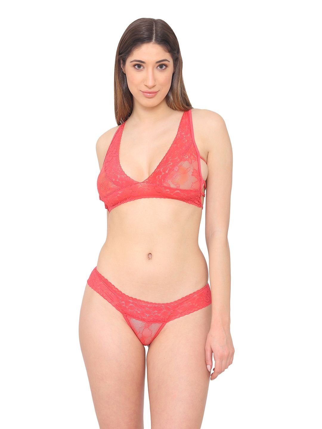 Make your outfit an outmost place of soft comfort including this stylist bra panty set from n-gal made from polyester acrylic. Comes with fully adjustable and stretchable straps. These bra panty set is soft non-padded lace bra. These are skin friendly inner wears lovely set of bra and crotchless thong g string low-rise panty has delicate lace embellishment.
