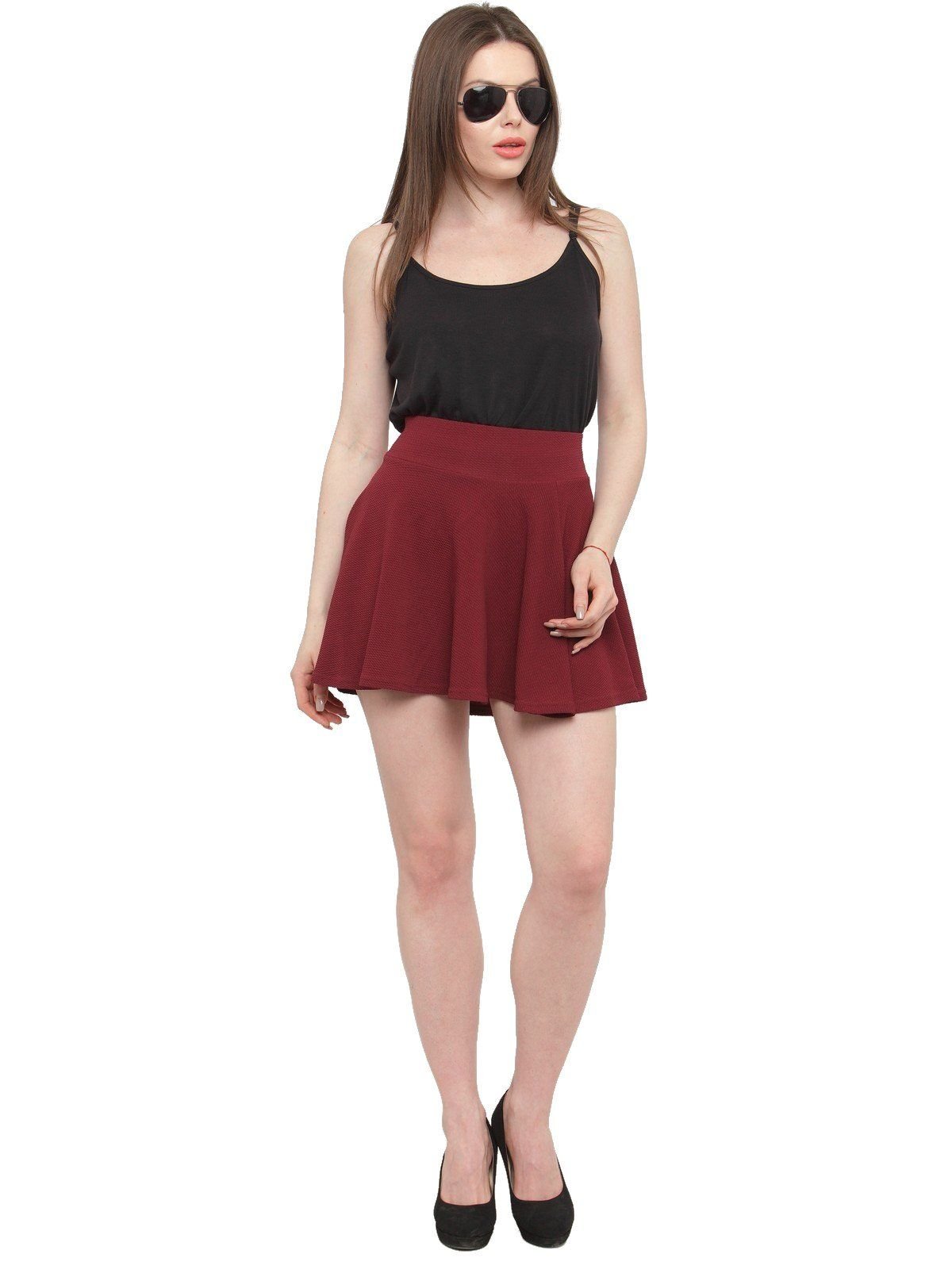N-Gal Women's Polyester Lycra High Waist Flared Knit Skater Short Mini Skirt _Maroon