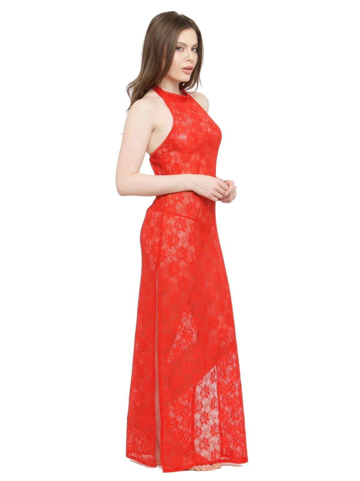 N-Gal Women's Polyester See-Thru Side Slit Lace Gown Night Dress with G-String_Red