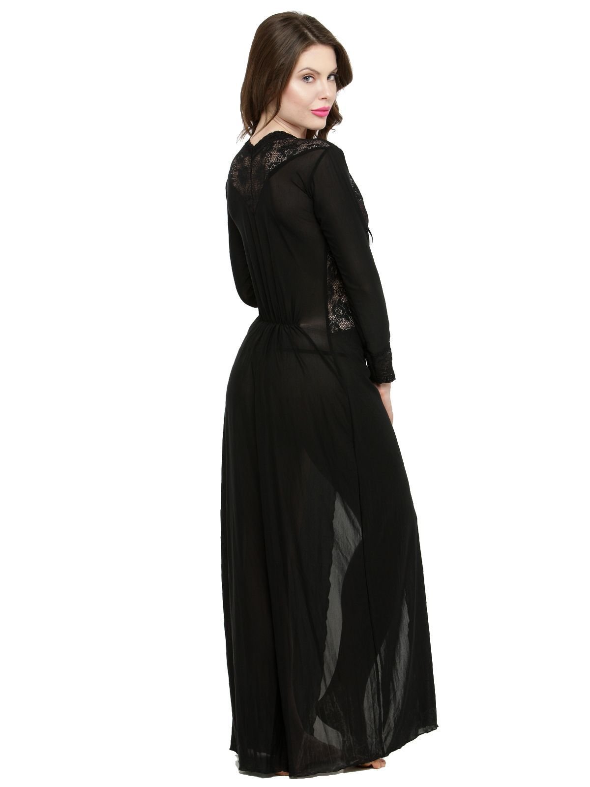 N-Gal Women's Polyester Spandex Deep Neck Lace Bridal Nightwear with G-String_Black