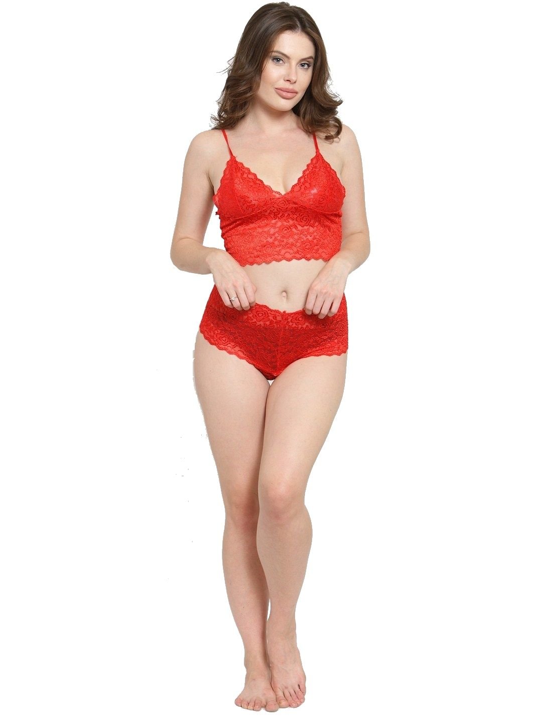 N-Gal Women's Polyester Spandex Floral Lace Top & High Waist Panty Lingerie Set Nightwear_Red