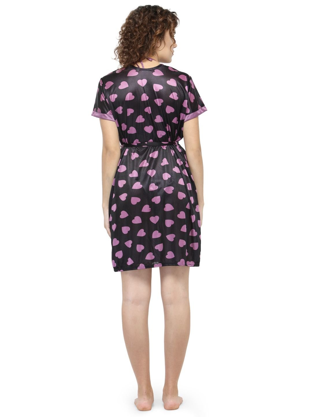 N-Gal Women's Satin Heart Print Bikini Thong Robe Lingerie Nightwear_Purple