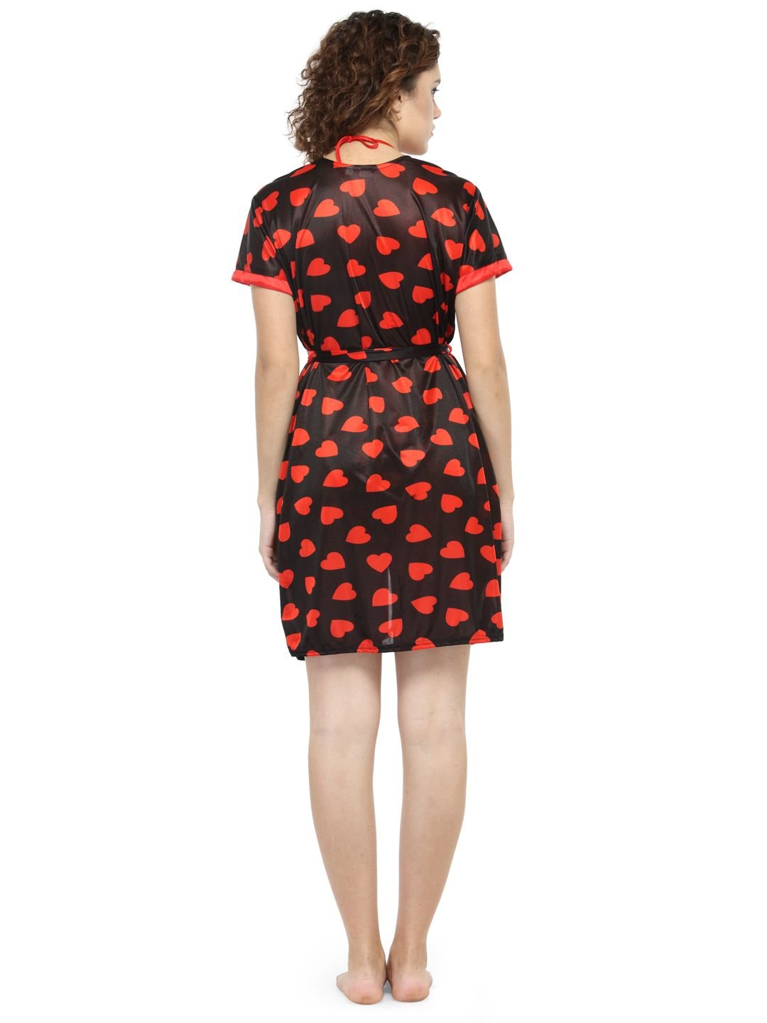 N-Gal Women's Satin Heart Print Bikini Thong Robe Lingerie Nightwear_Red