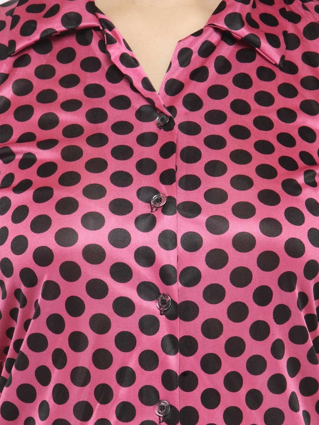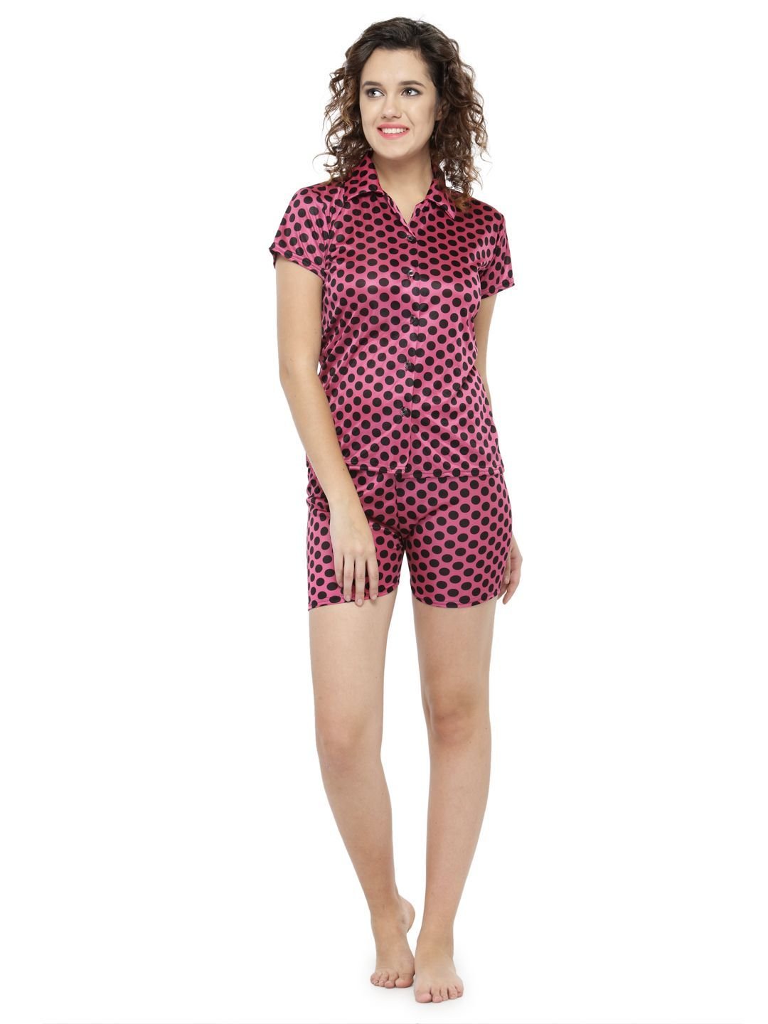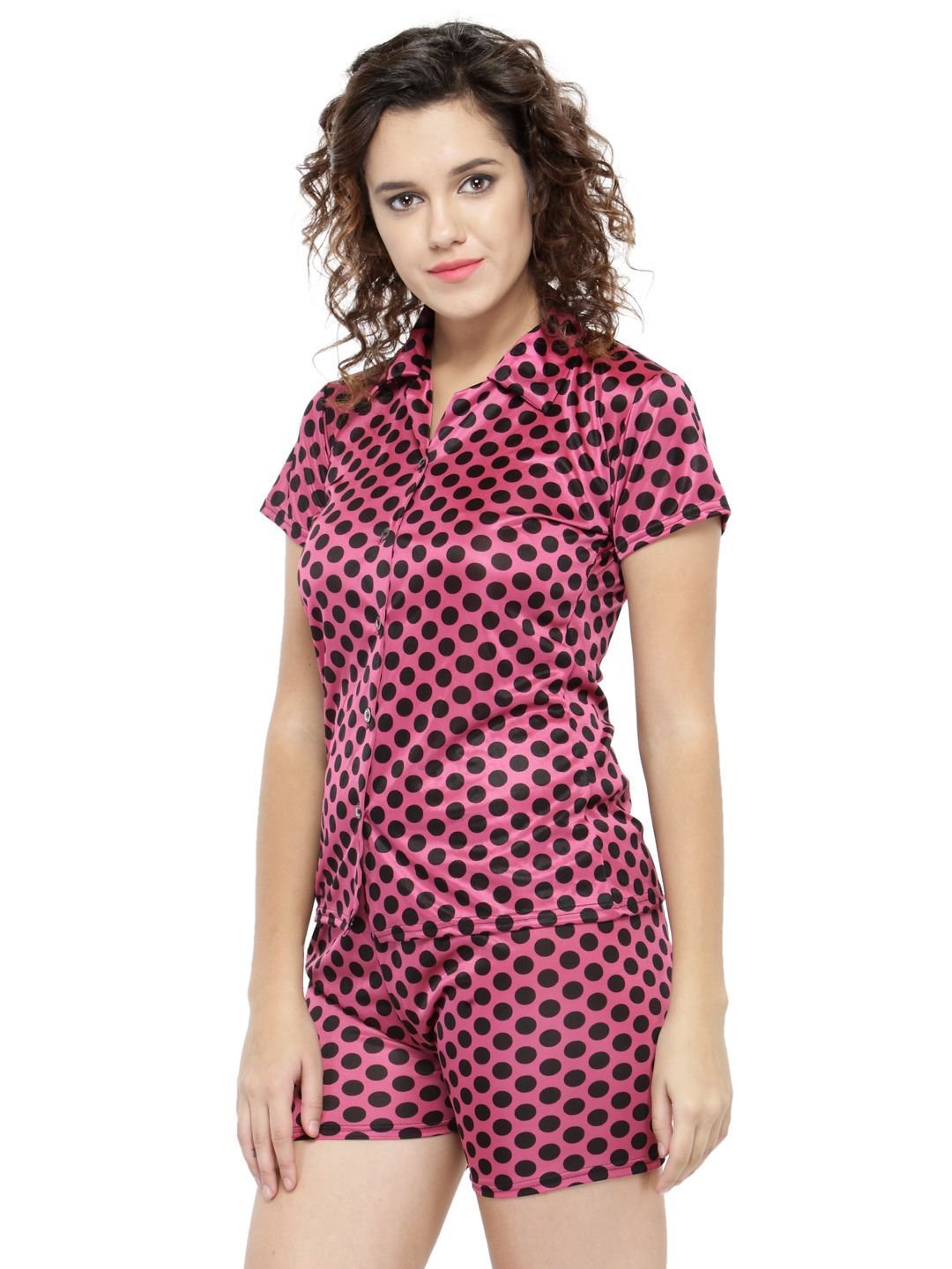 N-Gal Women's Satin Polka Dot Print Short Sleeves Shirt & Short Nightwear Lounge Sets_Pink